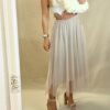 Ρομαντική midi φούστα με εξωτερικό τούλι και εσωτερική επένδυση. Διαθέτει λάστιχο στη μέση για άνετη εφαρμογή και κομψό, θηλυκό στυλ που ταιριάζει σε κάθε περίσταση. Καλύπτει S/M/L.