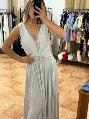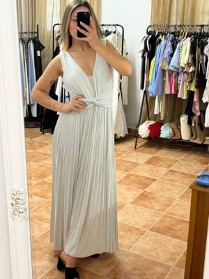 Εντυπωσιακό μακρύ φόρεμα σε απόχρωση του πάγου με μεταλλική λάμψη και πλισέ υφή. Το ύφασμά του είναι πολύ ελαστικό, μαλακό και αέρινο, προσφέροντας μοναδική άνεση. Το μπούστο διαθέτει ραμμένα cups, για να φορεθεί χωρίς σουτιέν, ενώ η εφαρμογή του αγκαλιάζει το σώμα με απόλυτη ελευθερία κινήσεων. Καλύπτει Small – Medium – Large λόγω της μεγάλης ελαστικότητας. Συνιστάται να φορεθεί με μπεζ εσώρουχα για φυσικό αποτέλεσμα. Ιδανικό για βραδινές εμφανίσεις, γάμους ή επίσημα events.