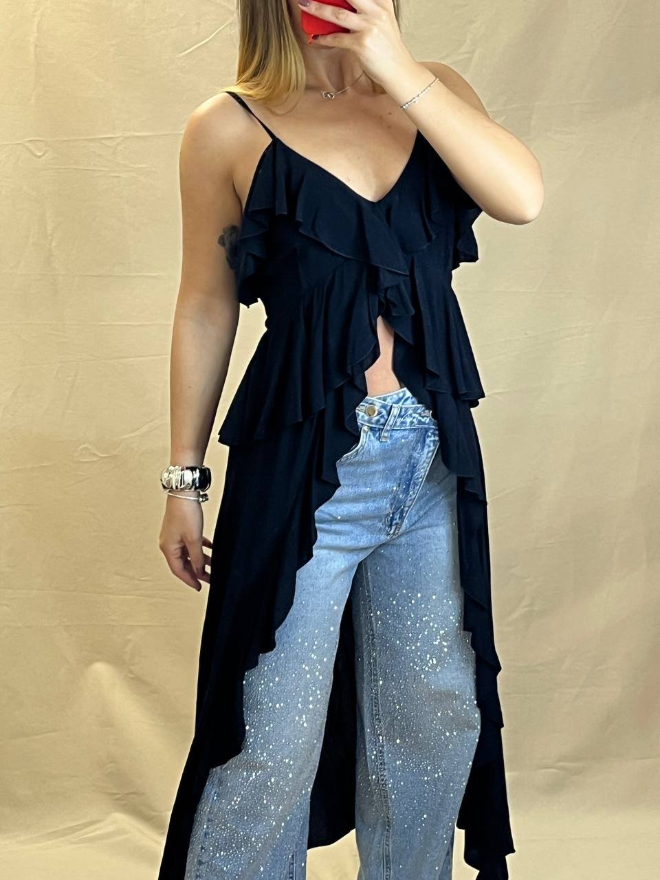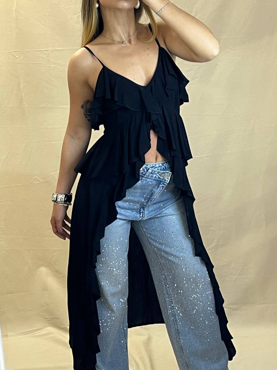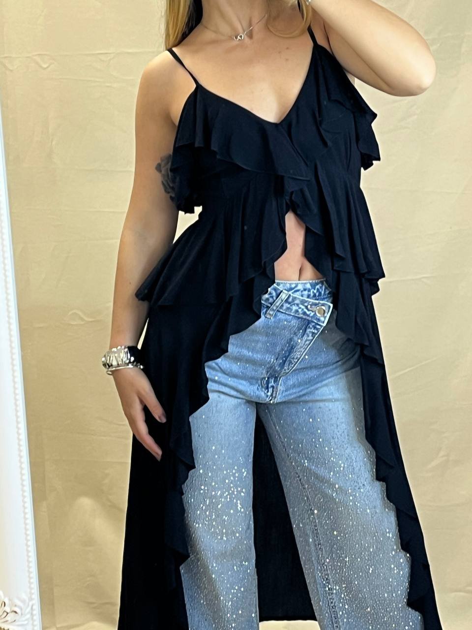 Αέρινη μαύρη μπλούζα με ασύμμετρο μήκος, λεπτές τιράντες και εντυπωσιακά βολάν. Ιδανική για layering πάνω από παντελόνια ή σορτς για ένα μοντέρνο, θηλυκό look.