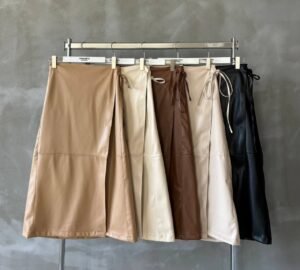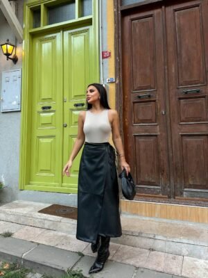 Αυτή η δερμάτινη φούστα από οικολογικό δέρμα συνδυάζει κομψότητα και πρακτικότητα, ιδανική για κάθε περίσταση. Διαθέτει ζώνη που δένει στη μέση και κουμπί μπροστά, προσφέροντας ευκολία και στυλ. Η απαλή υφή του δέρματος δίνει μια πολυτελή αίσθηση, ενώ η εσωτερική φόδρα εξασφαλίζει άνεση και τέλεια εφαρμογή. Ο μίνιμαλ αλλά μοντέρνος σχεδιασμός της την καθιστά κατάλληλη για καθημερινές ή βραδινές εμφανίσεις. Κατασκευασμένη από υψηλής ποιότητας υλικά, είναι μια διαχρονική και στιλάτη επιλογή που αναβαθμίζει κάθε ντύσιμο.