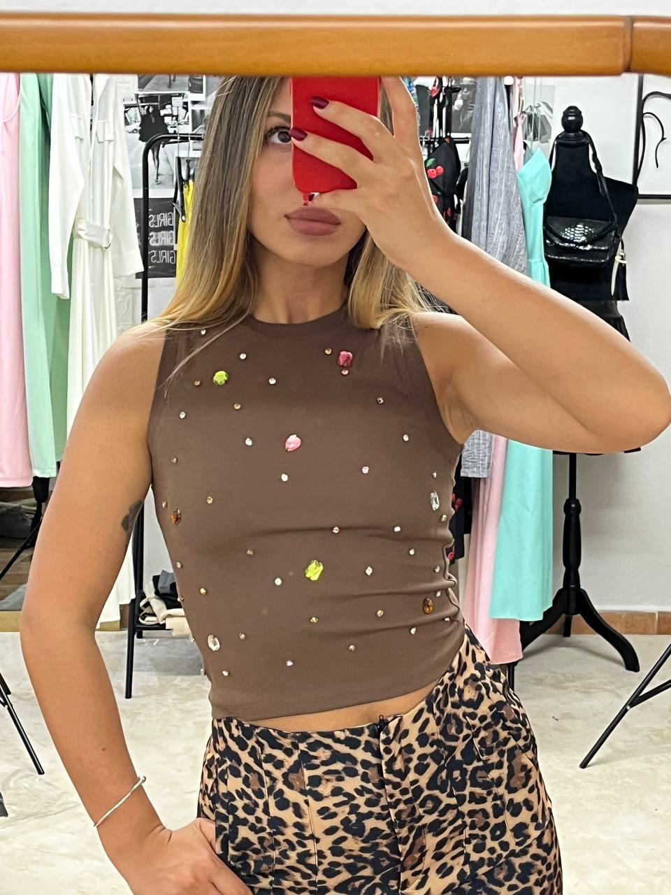 Αναδείξτε το στυλ σας με αυτό το εντυπωσιακό καφέ αμάνικο top, διακοσμημένο με πολύχρωμα στρας που προσθέτουν μια μοντέρνα και λαμπερή πινελιά. Το εφαρμοστό του κόψιμο αγκαλιάζει το σώμα, ενώ το ελαστικό ύφασμα προσφέρει άνεση και κομψότητα. Ιδανικό για βραδινές εξόδους, πάρτι ή μια fashion-forward εμφάνιση.