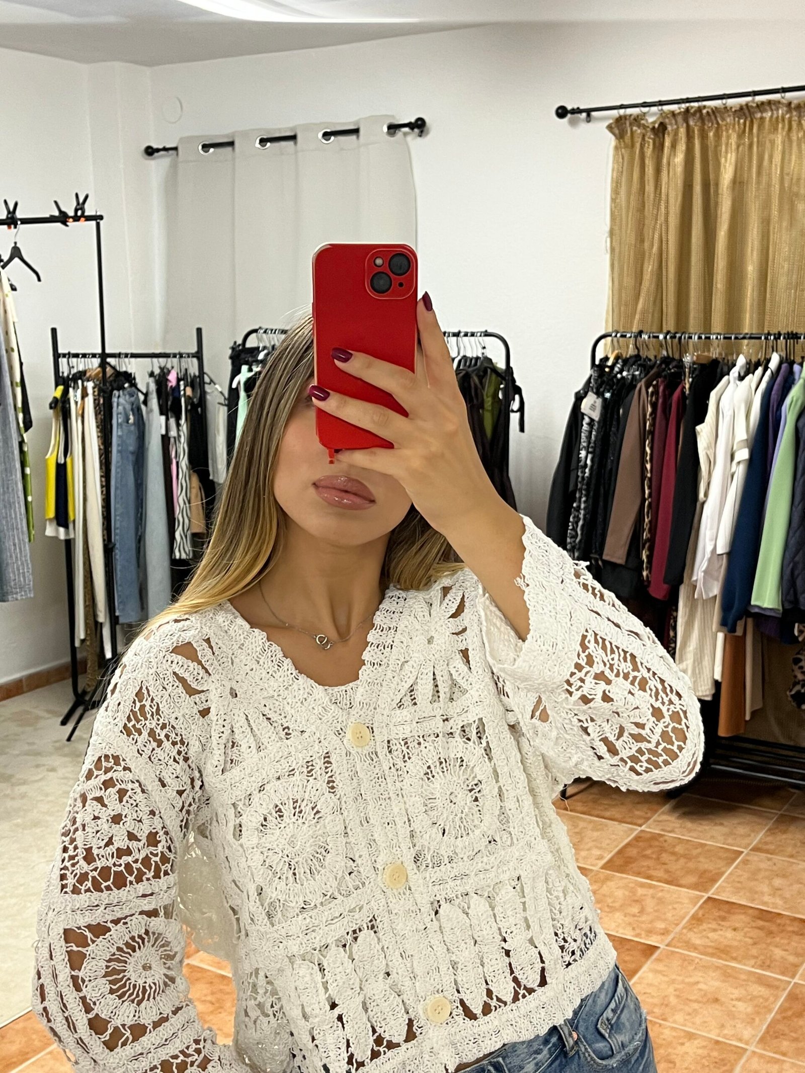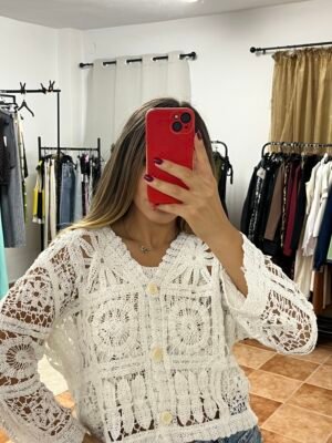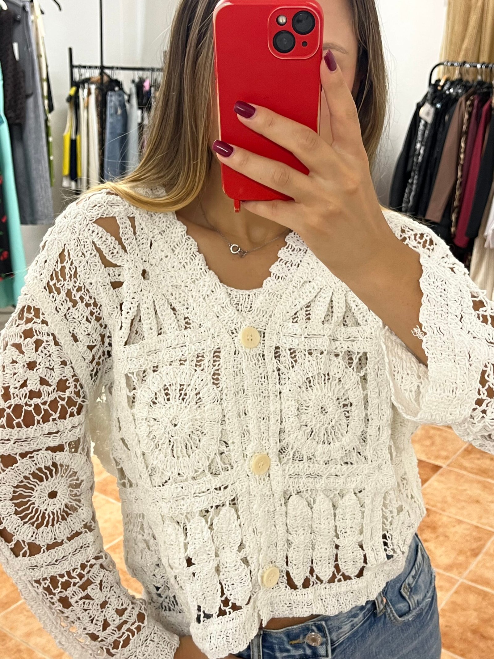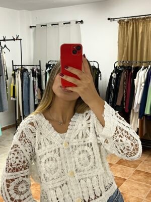 Αέρινη λευκή πλεκτή ζακέτα με κουμπιά, ιδανική για layering τις ανοιξιάτικες και καλοκαιρινές μέρες. Το σχέδιο της θυμίζει χειροποίητο στιλ με γεωμετρικά και κυκλικά μοτίβα, ενώ η διαφάνεια προσθέτει μια ανάλαφρη, κομψή πινελιά. Κλείνει με κουμπιά στο μπροστινό μέρος.