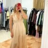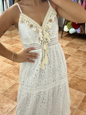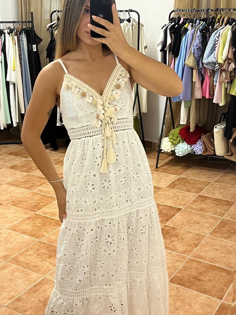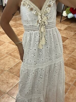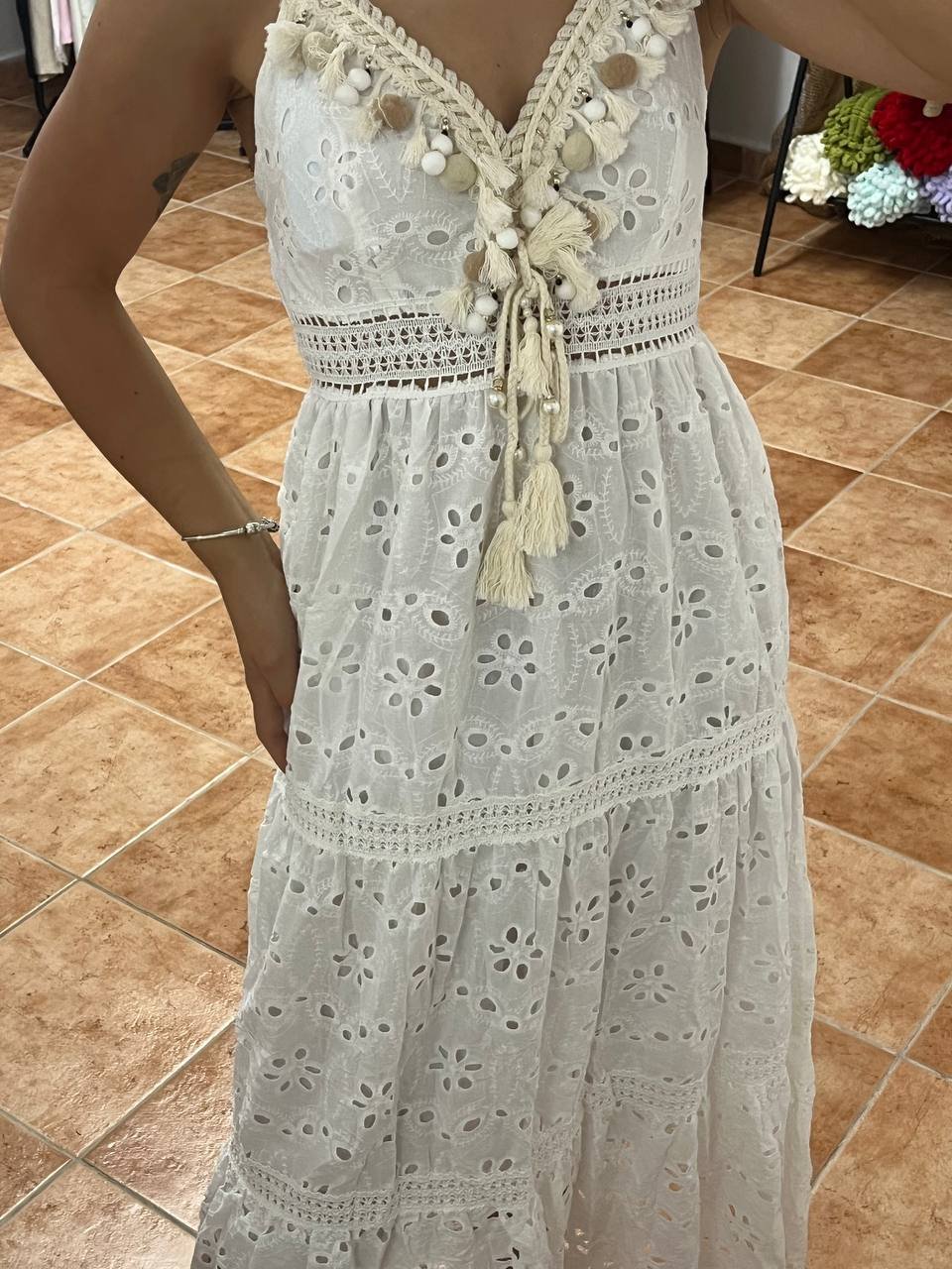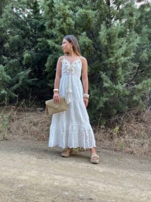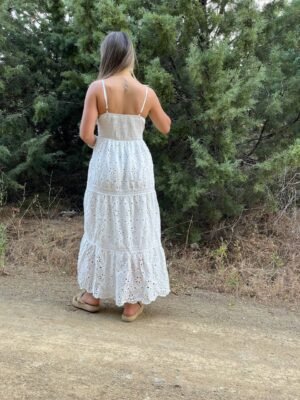 Ρομαντικό και κομψό μακρύ φόρεμα σε λευκό χρώμα με εντυπωσιακή διάτρητη κεντημένη δαντέλα. Διαθέτει λεπτές τιράντες, διακοσμητικά φουντάκια και V ντεκολτέ, ενώ η σφηκοφωλιά (λάστιχο) στην πλάτη προσφέρει άνετη εφαρμογή. Το ελαφρύ του ύφασμα, σε συνδυασμό με την εσωτερική επένδυση, το καθιστά ιδανικό για καλοκαιρινές εμφανίσεις, βόλτες ή και νησιώτικα looks. Καλύπτει Small έως Large 100% βαμβακερό.
