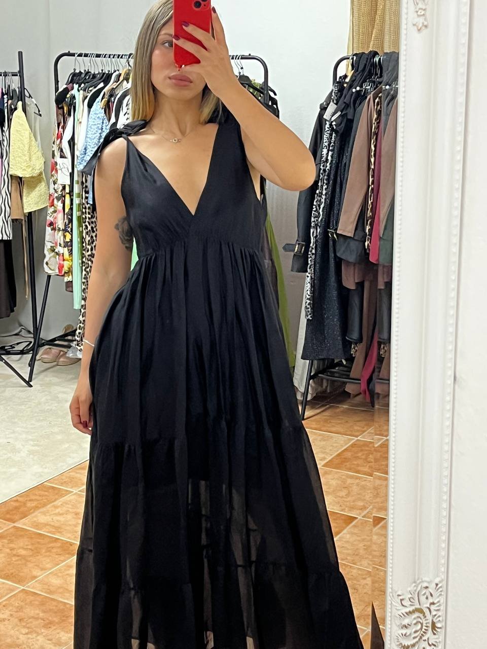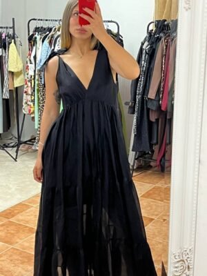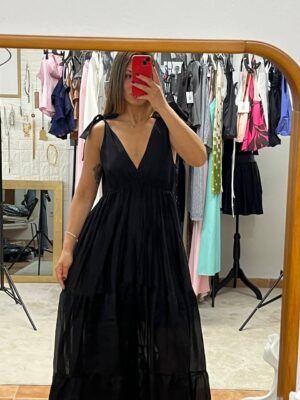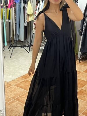 Κλασική κομψότητα σε ένα αέρινο μακρύ φόρεμα με φιόγκους στους ώμους και εσωτερική επένδυση για τέλεια εφαρμογή και κάλυψη. Το μαύρο χρώμα προσφέρει διαχρονικότητα και μπορεί να φορεθεί σε κάθε περίσταση, ενώ η ελαφριά γραμμή του καλύπτει άνετα Small έως Large. Ιδανική επιλογή για βάπτιση, γάμο, βραδινές εξόδους ή επίσημες εμφανίσεις. Θηλυκό, ρομαντικό και κομψό.