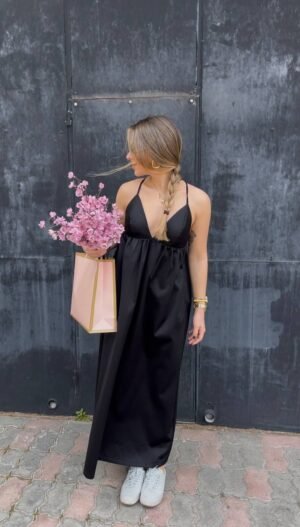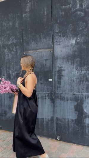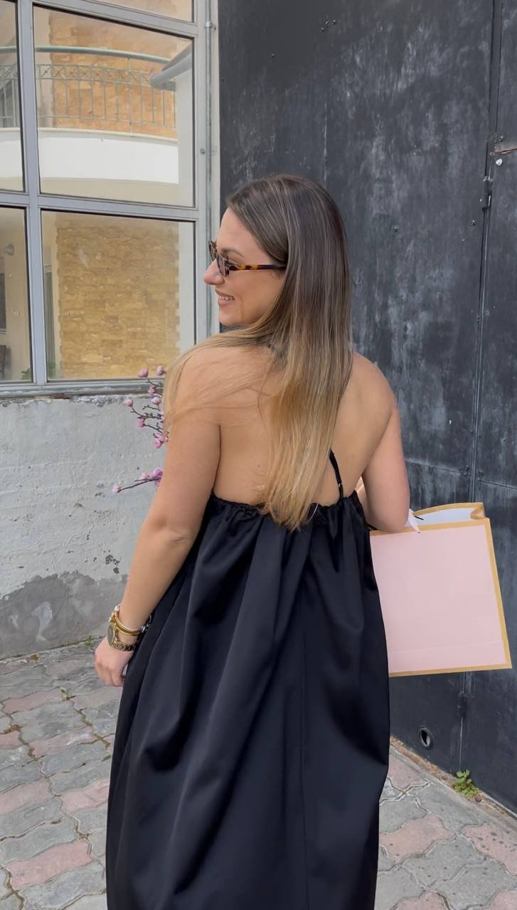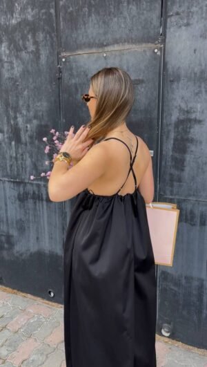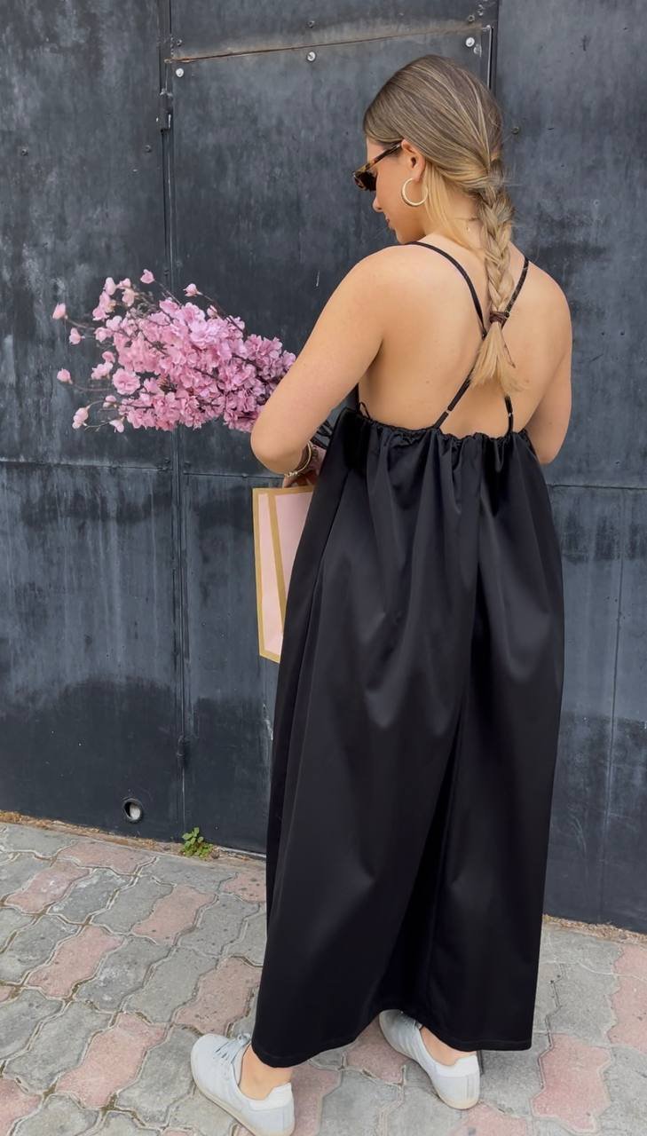 Αέρινο μαύρο φόρεμα από σατέν ύφασμα, με τριγωνάκι ντεκολτέ και λεπτές ρυθμιζόμενες τιράντες Χ στην πλάτη. Άνετη εφαρμογή και μοναδικό στρώσιμο, ιδανικό για chic εμφανίσεις από το πρωί έως το βράδυ.