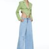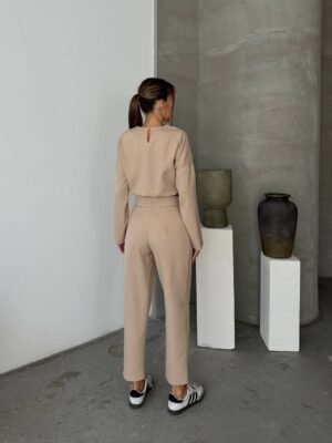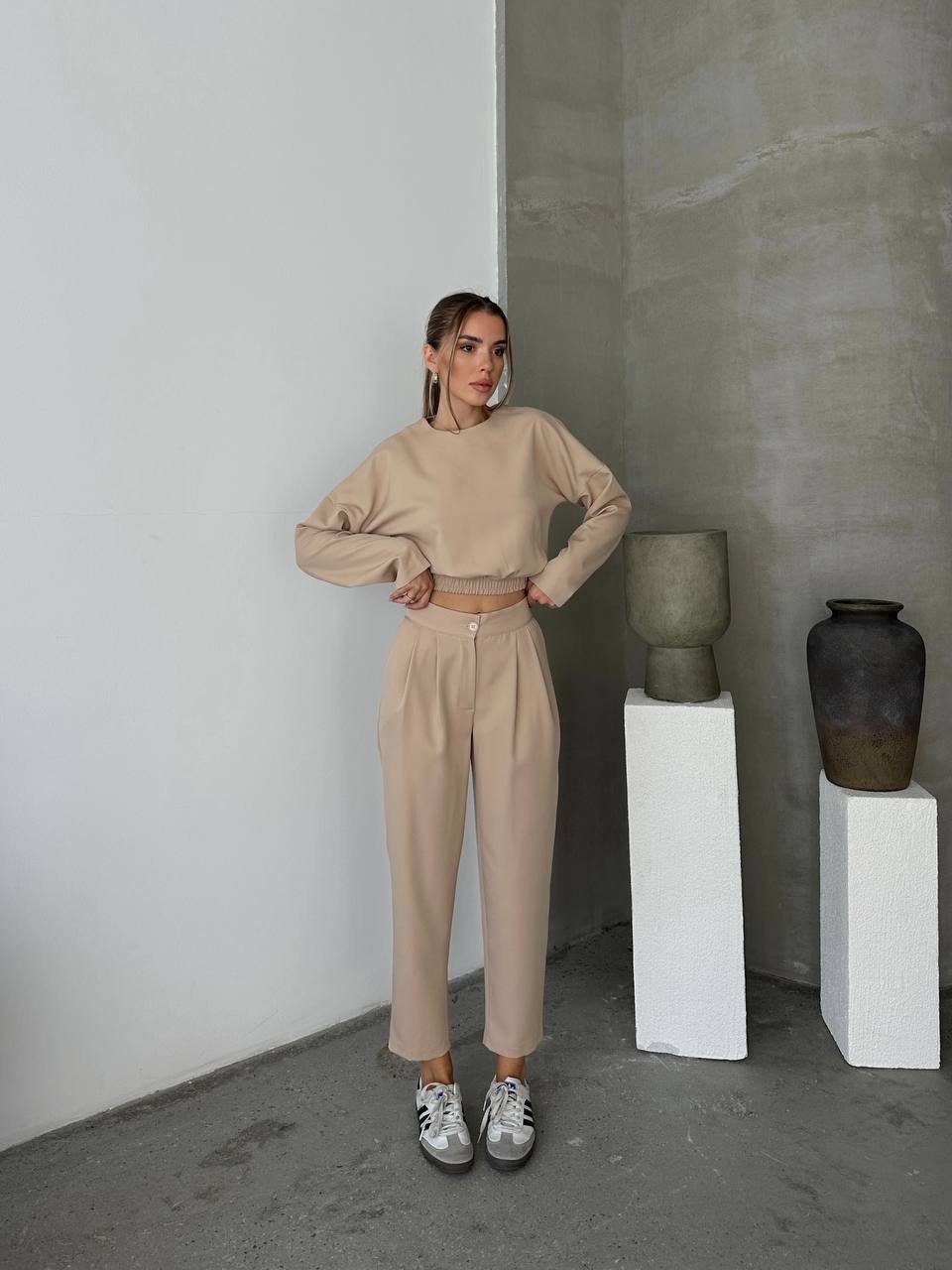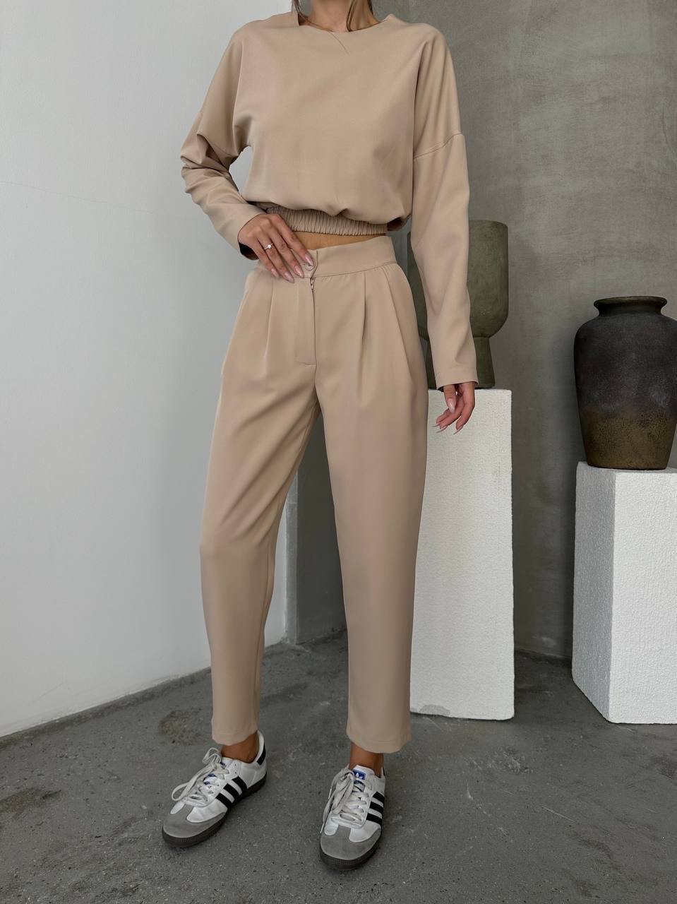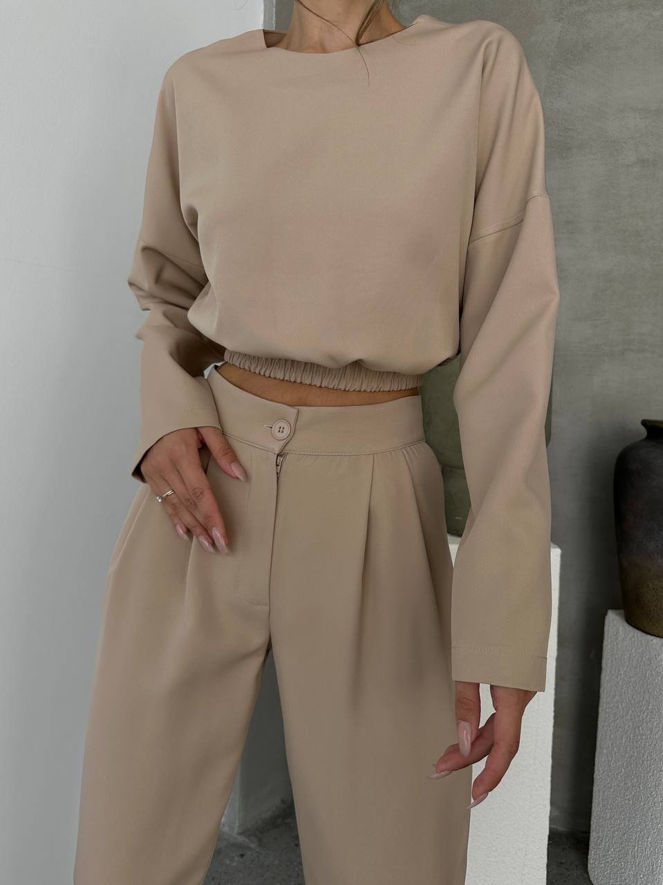Μπεζ γυναικείο σετ γραφείου με παντελόνι cigarette και άνετη μπλούζα με μακρύ μανίκι και ελαστική ζώνη. Το παντελόνι διαθέτει κουμπί. Ιδανικό για συνδυασμό με τακούνια ή sneakers.