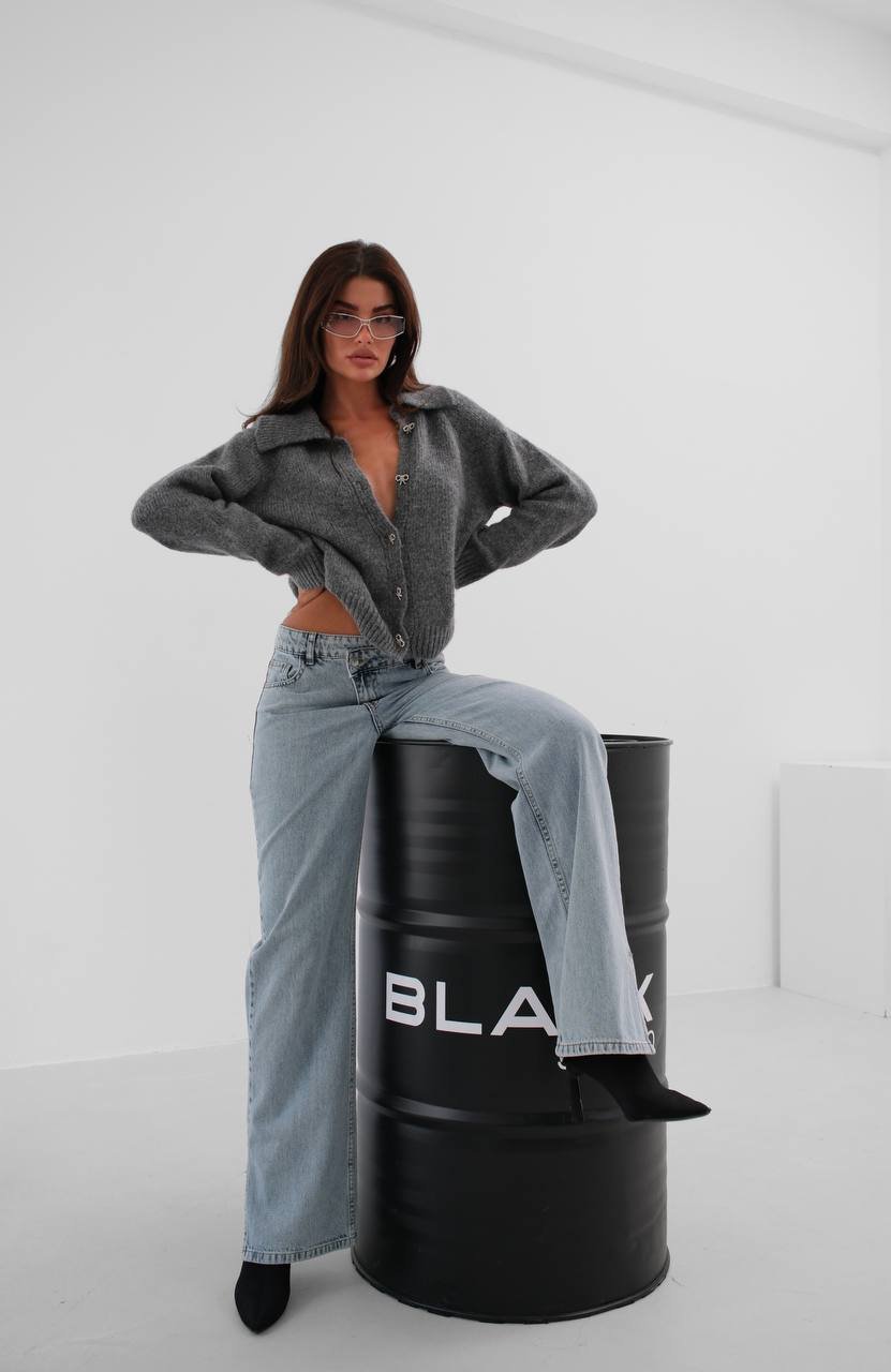Πλεκτή ζακέτα σε γκρι χρώμα με διαμαντένιες λεπτομέρειες και φιόγκους στα κουμπιά. One-size και ελαστική, καλύπτει μεγέθη έως large. Ιδανική για να προσθέσετε λάμψη και κομψότητα σε κάθε εμφάνιση.