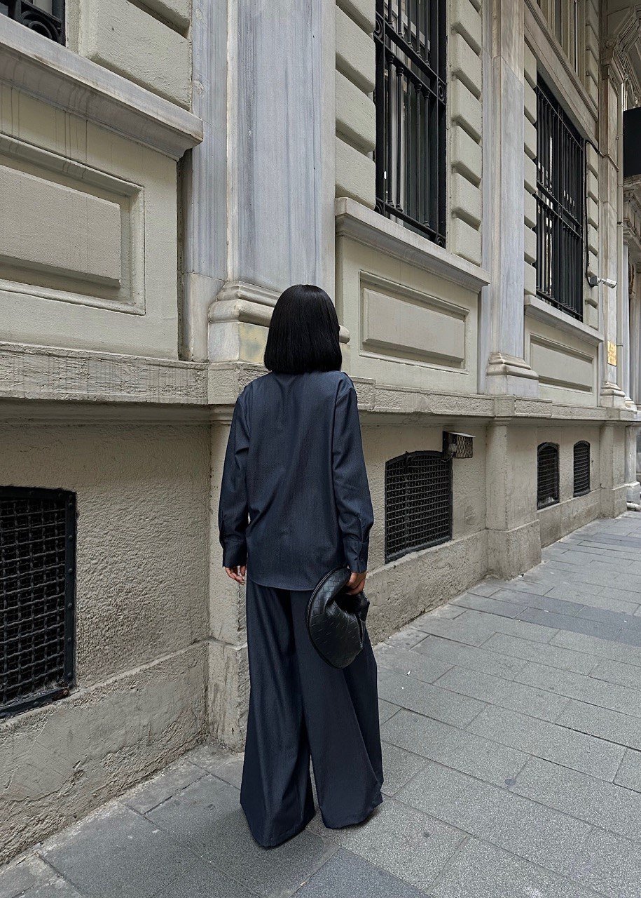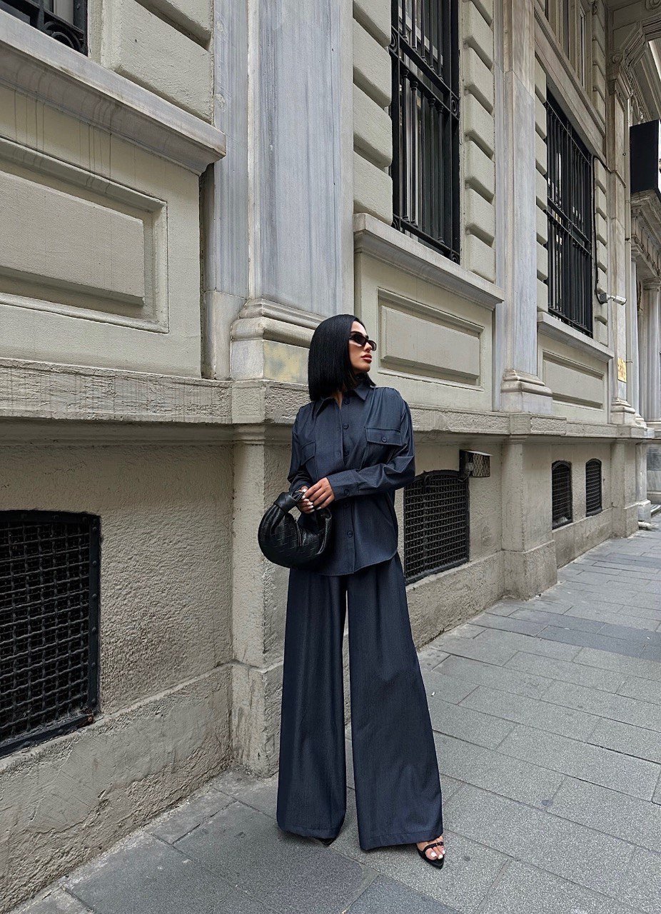 Τζιν σετ με παντελόνι ίσιας γραμμής, ελαστικό με λάστιχο στη μέση. Άνετη και κομψή επιλογή για το γραφείο, ιδανικό για να συνδυαστεί και χωριστά.