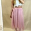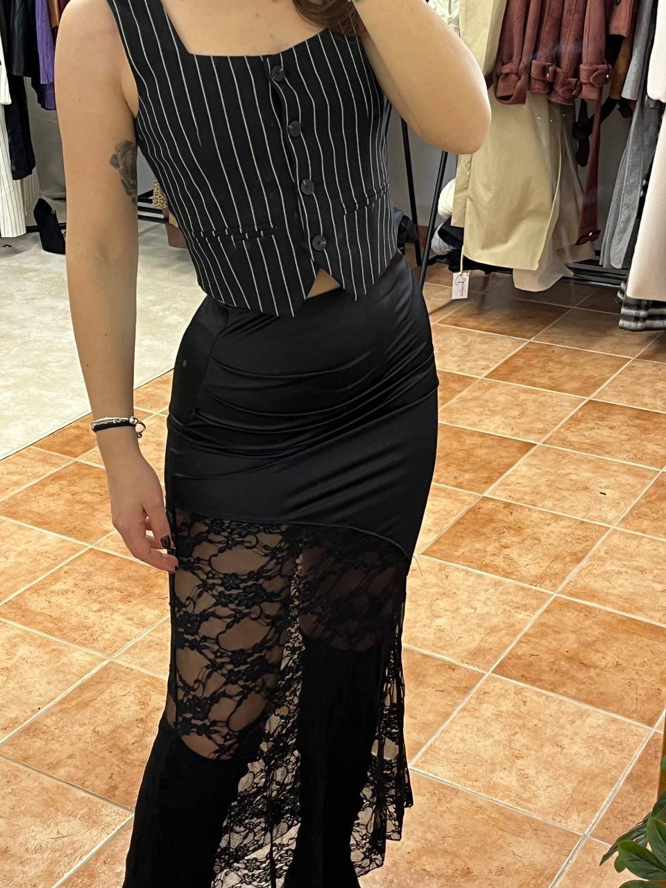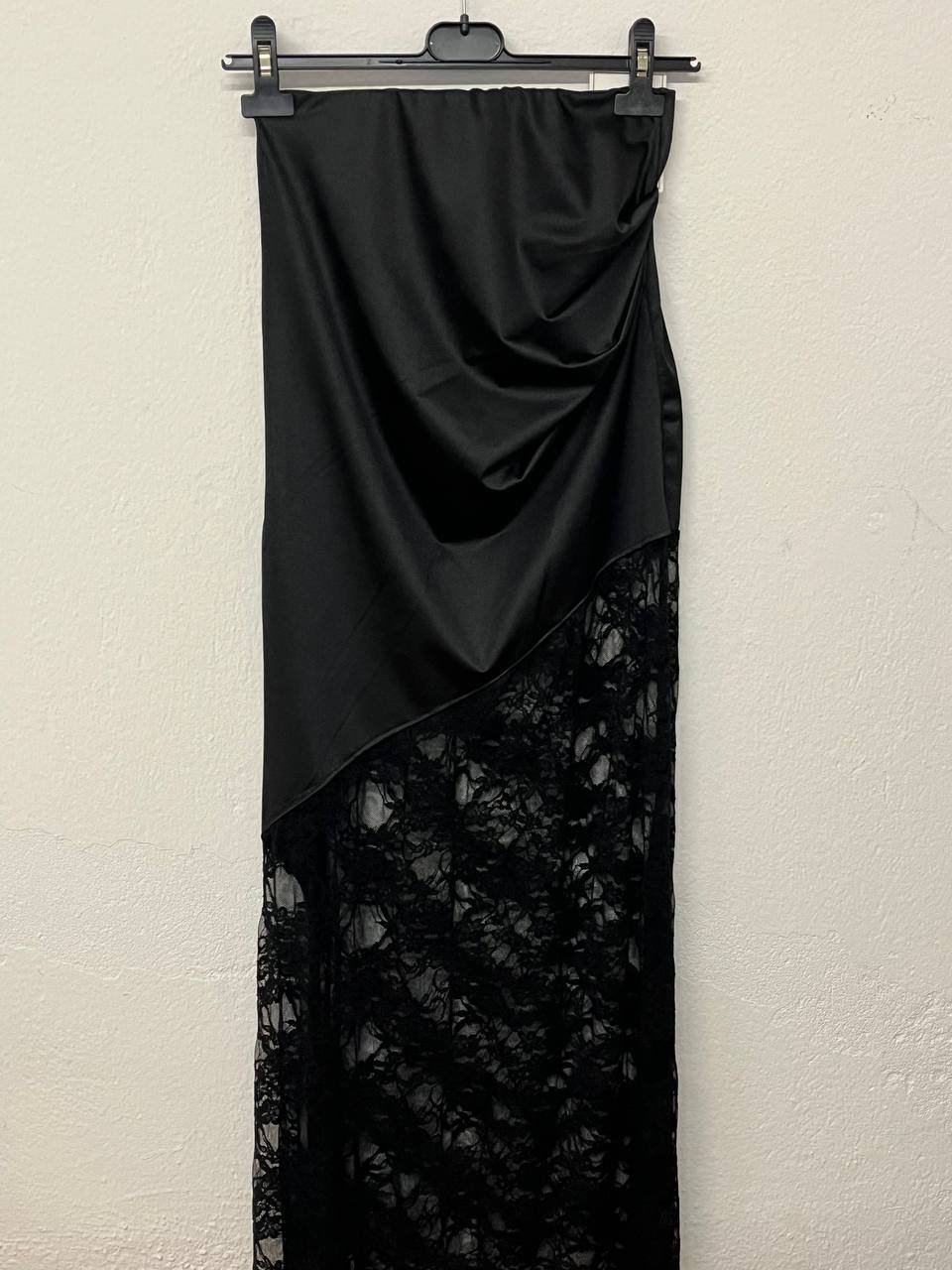 Αναδείξτε το στυλ σας με αυτή τη μοναδική μαύρη φούστα! Το επάνω μέρος της είναι κατασκευασμένο από ελαστικό ύφασμα με λαστιχο στη μέση για άνετη εφαρμογή, ενώ το κάτω μέρος διαθέτει εντυπωσιακή δαντέλα που προσθέτει μια θηλυκή και αέρινη αίσθηση. Η γραμμή της είναι ασύμμετρη, προσφέροντας έναν κομψό και μοντέρνο συνδυασμό.