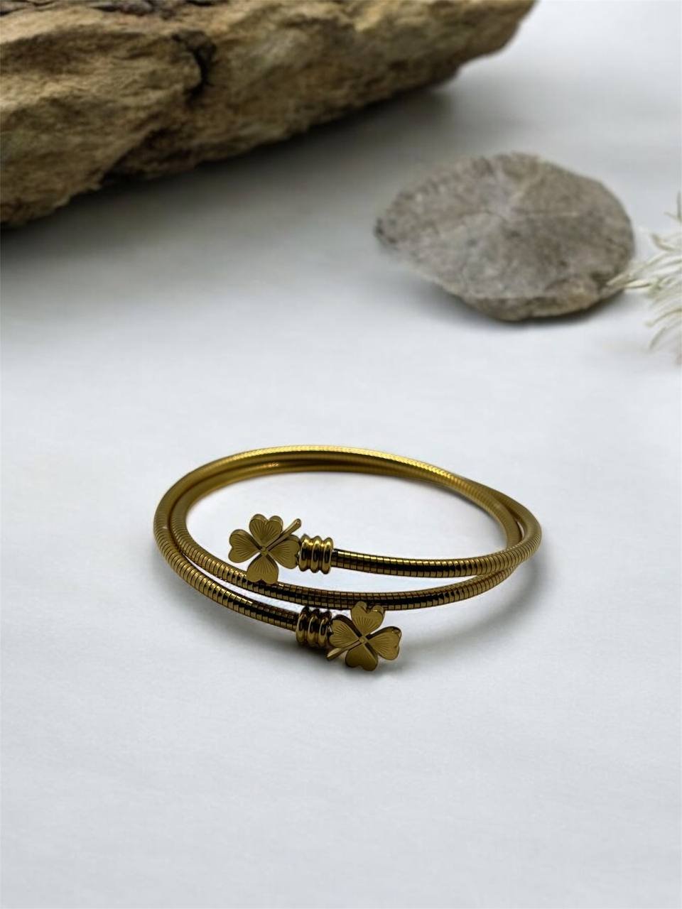 Εντυπωσιακό γυριστό χρυσό βραχιόλι με τετράφυλλα τριφύλλια στις άκρες, σύμβολο τύχης και ευημερίας. Κομψό και διαχρονικό, ιδανικό για κάθε περίσταση.