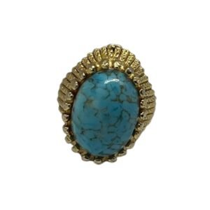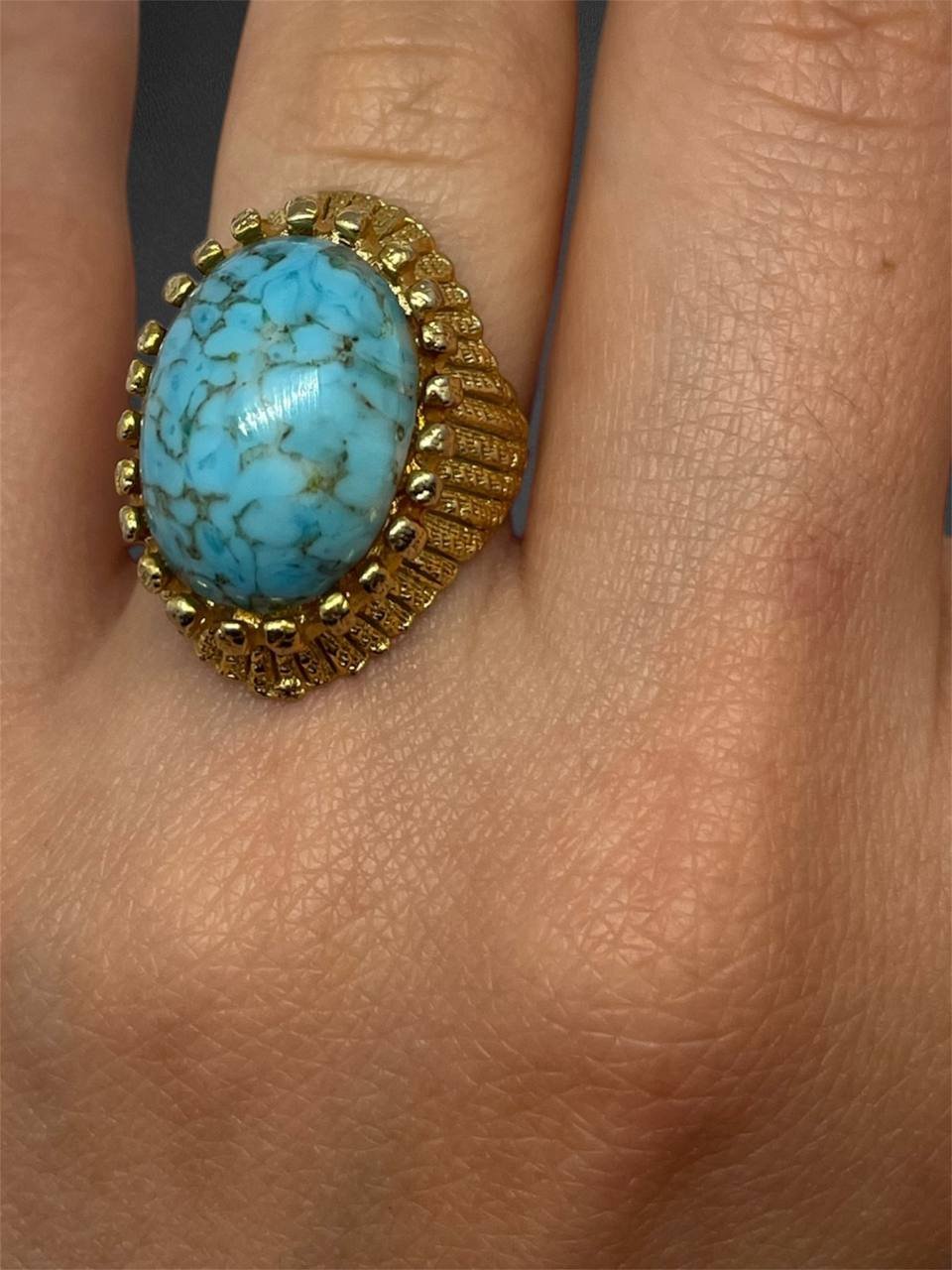 Εντυπωσιακό ατσάλινο χρυσό δαχτυλίδι με μεγάλη γαλάζια πέτρα σε στυλ τιρκουάζ. Statement κόσμημα που τραβάει τα βλέμματα σε κάθε περίσταση.