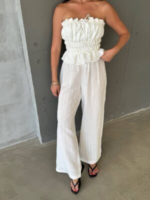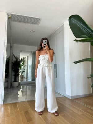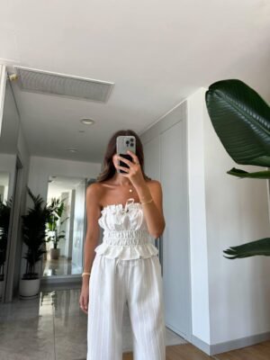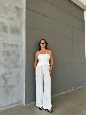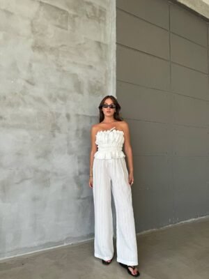 Το σετ Airy Dream συνδυάζει την αίσθηση της άνεσης με την κομψότητα. Το λευκό, αέρινο και ανάλαφρο ύφασμα του φανελάκι και του παντελονιού δημιουργεί την τέλεια ισορροπία μεταξύ casual και στυλάτου. Το παντελόνι με φαρδιά γραμμή και το στραπλες μπλουζάκι με διακριτικό δέσιμο προσφέρουν μία ελεύθερη, μοντέρνα γραμμή που αγκαλιάζει το σώμα χωρίς να περιορίζει τις κινήσεις. Ιδανικό για καθημερινές εμφανίσεις με στυλ, που αναδεικνύει τον αέρα της ελευθερίας και της αβίαστης κομψότητας.