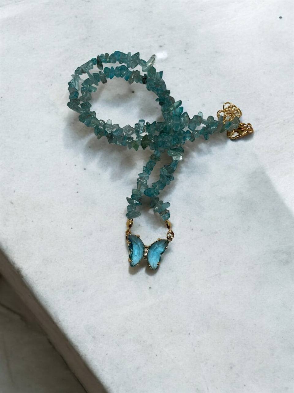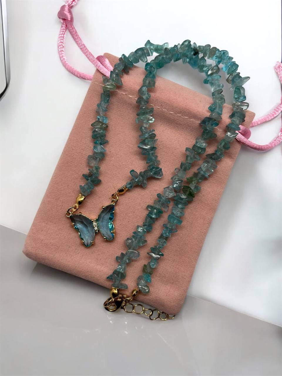 Ένα κομψό κολιέ με μπλε κρυστάλλινη πέταλουδα και πέτρες σε μπλε απόχρωση, με μακριά αλυσίδα που προσφέρει μοντέρνα και κομψή αίσθηση.