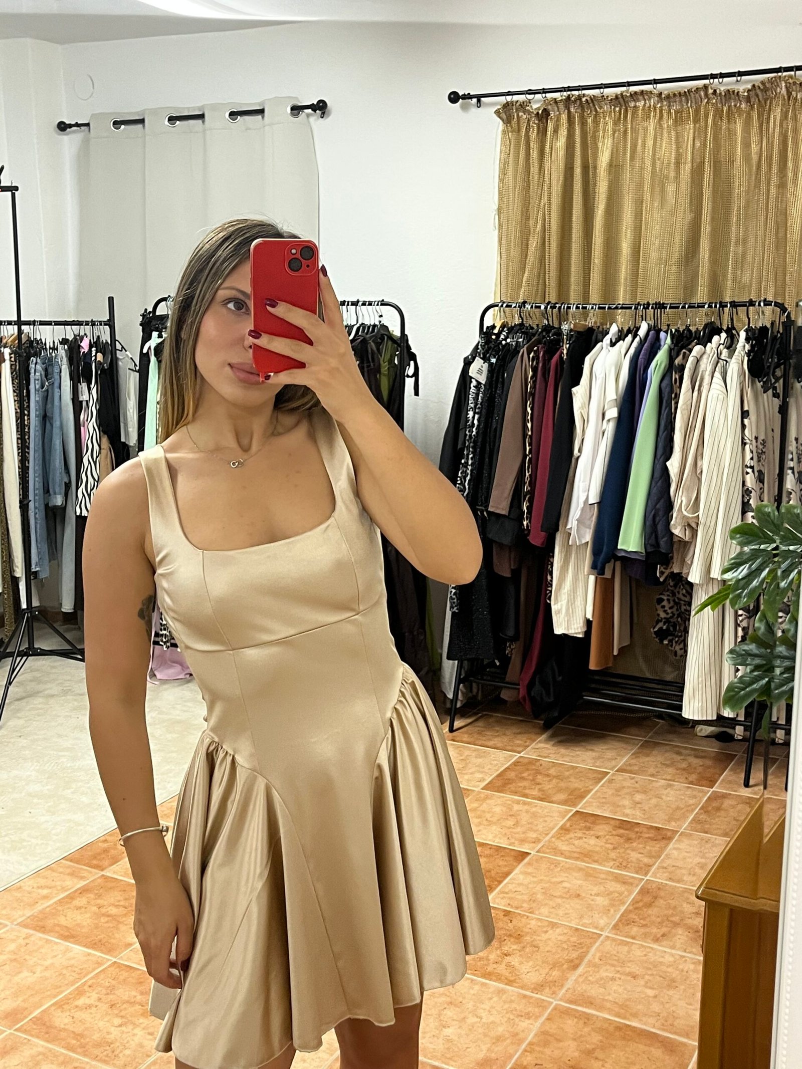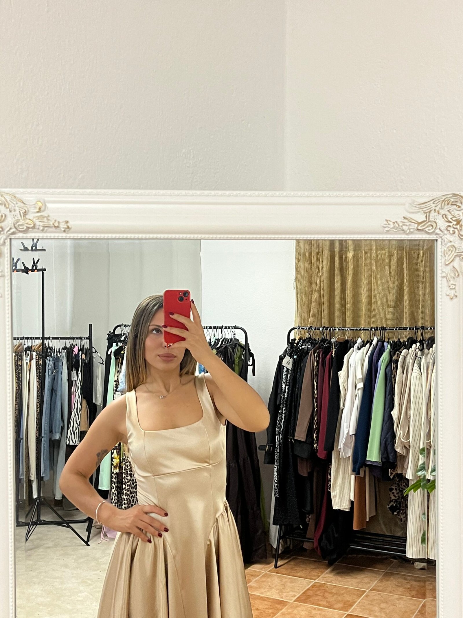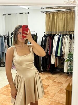 Λαμπερό και θηλυκό, το Champagne Dream φόρεμα είναι η ιδανική επιλογή για ξεχωριστές εμφανίσεις. Το σατινέ του ύφασμα προσφέρει μια πολυτελή αίσθηση, ενώ η ελαφρώς ανοιχτή λαιμόκοψη με cups στο μπούστο δίνει σταθερότητα και όμορφο κράτημα. Κλείνει με φερμουάρ στην πλάτη και διαθέτει ενσωματωμένο ζωνάκι τύπου γιόγκο για να προσαρμόζεται στη μέση και να τονίζει τη σιλουέτα.