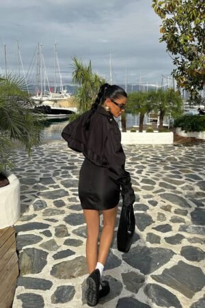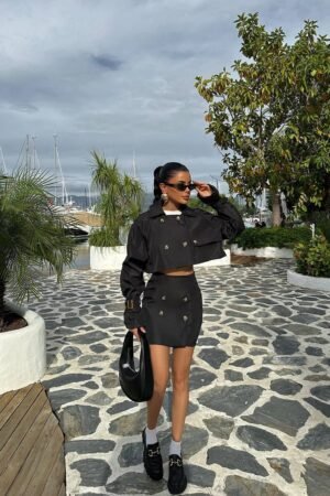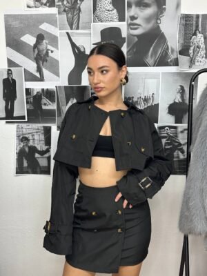 Απογειώστε το στυλ σας με αυτό το κομψό μαύρο σετ δύο τεμαχίων, που αποτελείται από ένα cropped trench-style σακάκι και μία μίνι φούστα με διπλή σειρά κουμπιών. Το σακάκι διαθέτει oversized μανίκια με ζώνες στις μανσέτες και statement κουμπιά, ενώ η μίνι φούστα χαρίζει μοντέρνα και θηλυκή αισθητική. Ιδανικό για day-to-night εμφανίσεις με μοντέρνα διάθεση.
