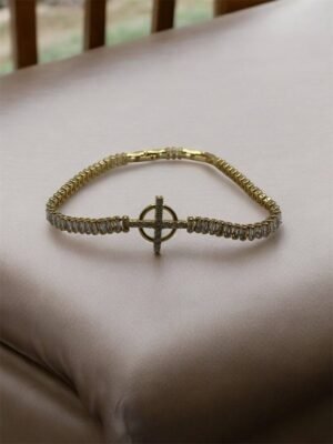 Αυτό το κομψό βραχιόλι ριβιέρα σε χρυσό και ασημί χρώμα με ρυθμιζόμενο κούμπωμα και είναι διακοσμημένο με διαμαντάκια στο μπρασελέ και έναν εντυπωσιακό σταυρό με διαμαντάκια στη μέση
