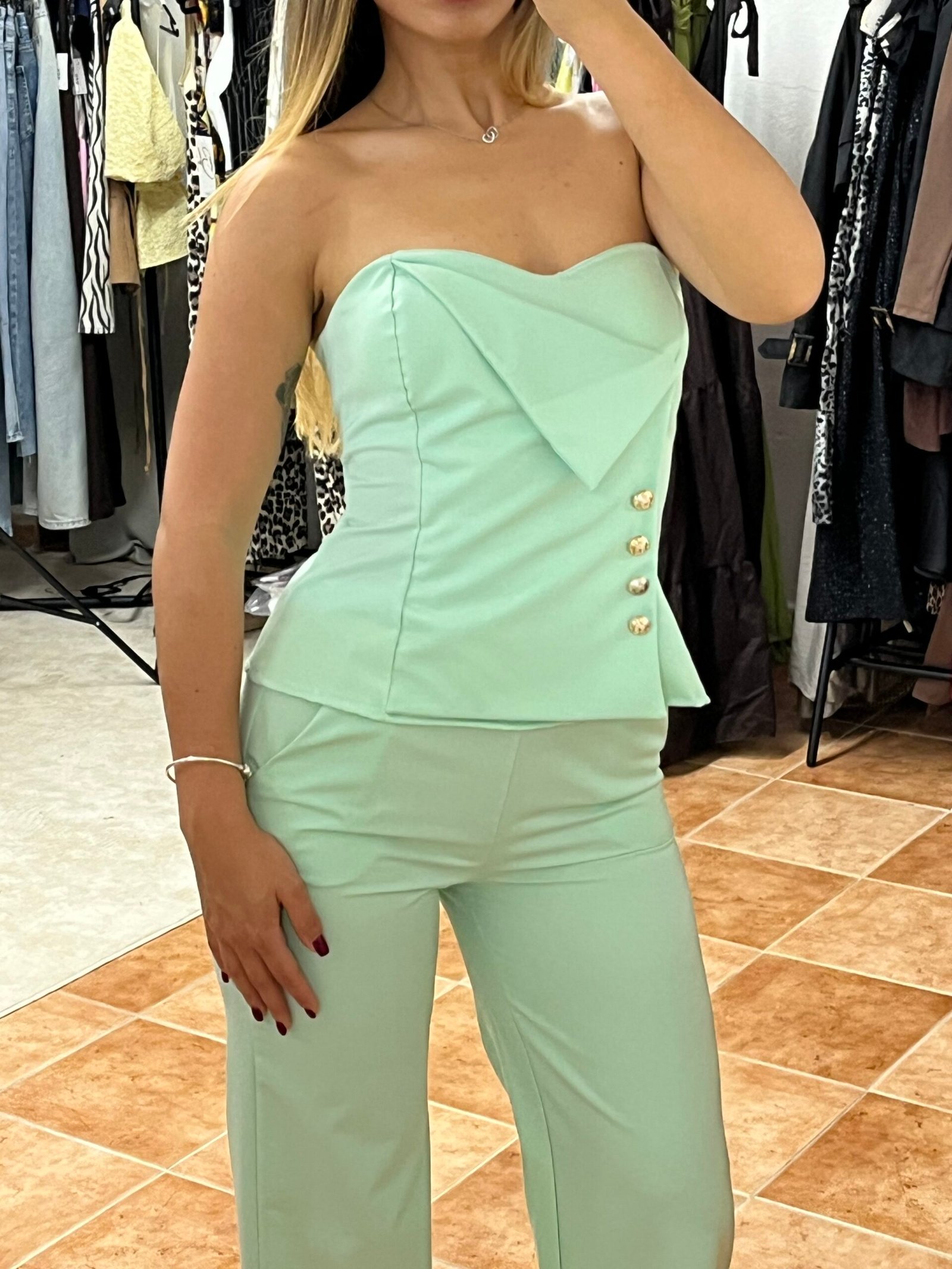 Το Golden Edge Pistachio είναι το πιο δροσερό και στιλάτο σετ της σεζόν! Η στράπλες μπλούζα με τα χρυσά διακοσμητικά κουμπιά στο πλάι και το λάστιχο στην πλάτη προσφέρει σταθερότητα και άνεση, ενώ το παντελόνι σε άλφα γραμμή προσδίδει κομψότητα και κίνηση. Το ιδιαίτερο φιστικί χρώμα απογειώνει κάθε εμφάνιση!