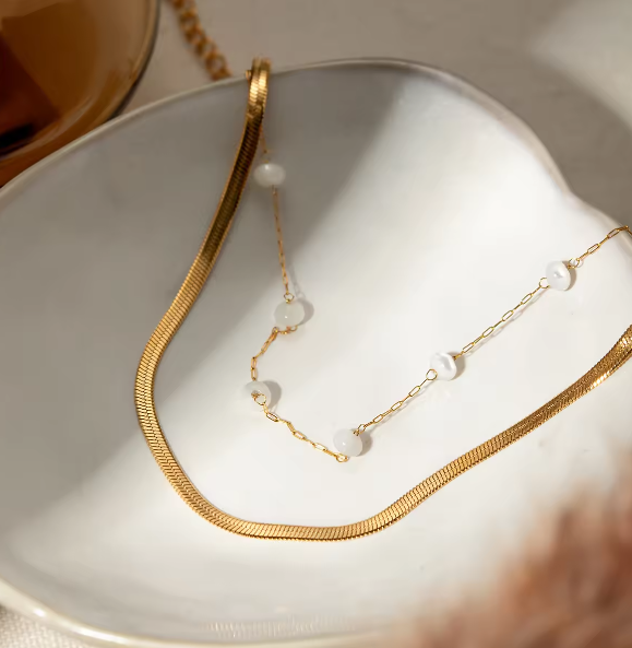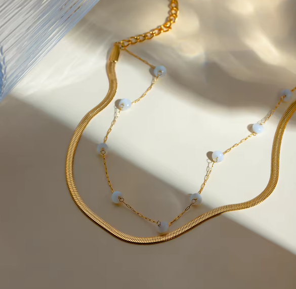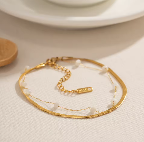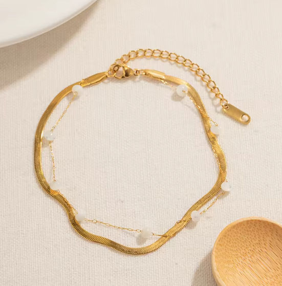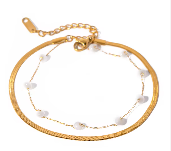 Κομψό διπλό ατσλάλινο βραχιόλι με χρυσή αλυσίδα και χρυσή λεπτή κλωστή διακοσμημένη με πέρλες. Ιδανικό για elegant layering και καθημερινή πολυτέλεια.