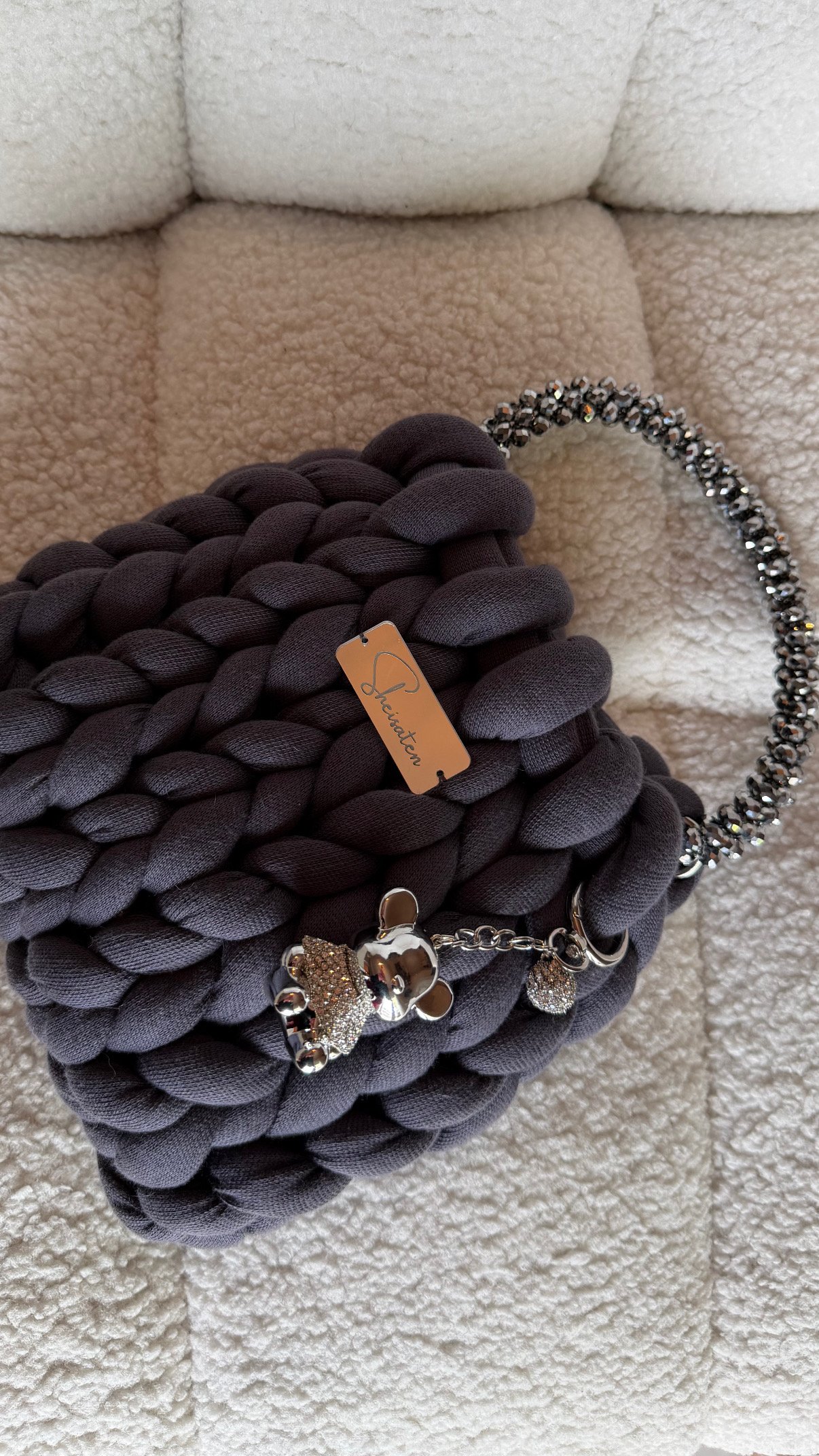 Χειροποίητη πλεκτή τσάντα σε γκρι ανθρακί απόχρωση, σχεδιασμένη για να ξεχωρίζει σε κάθε εμφάνιση. Το ιδιαίτερο chunky πλέξιμο δημιουργεί ένα εντυπωσιακό, μοντέρνο αποτέλεσμα, ενώ η απαλή υφή της προσφέρει μοναδική αίσθηση πολυτέλειας.