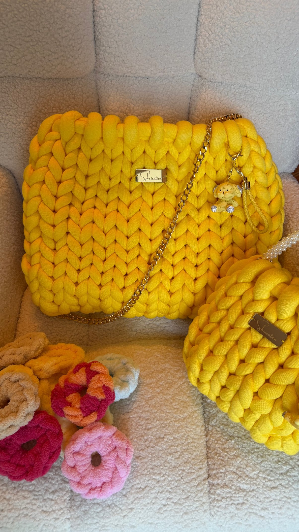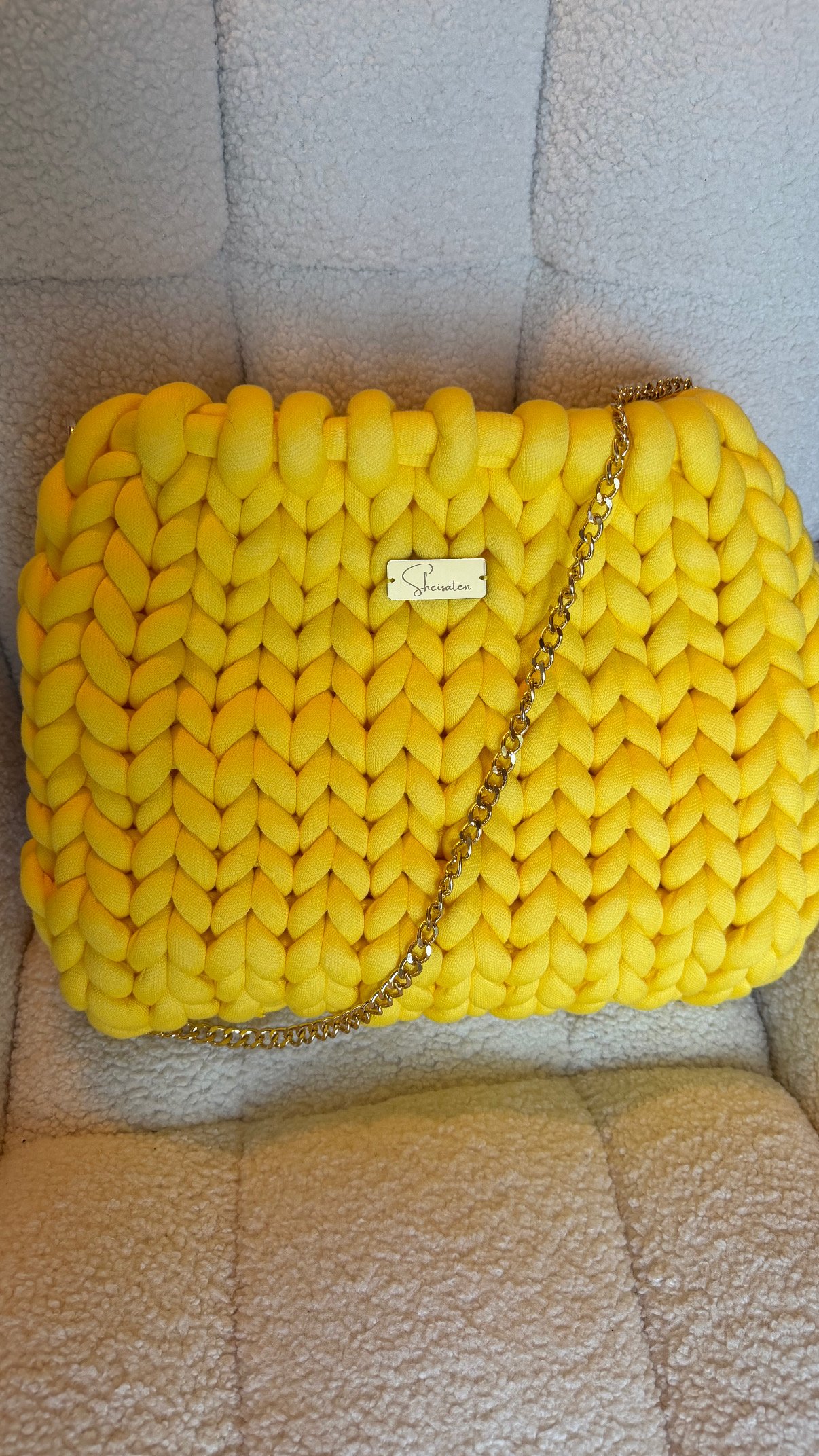 Χειροποίητη πλεκτή τσάντα σε κίτρινη απόχρωση Γίγας περίπου 45 εκατοστά , σχεδιασμένη για να ξεχωρίζει σε κάθε εμφάνιση. Το ιδιαίτερο chunky πλέξιμο δημιουργεί ένα εντυπωσιακό, μοντέρνο αποτέλεσμα, ενώ η απαλή υφή της προσφέρει μοναδική αίσθηση πολυτέλειας.