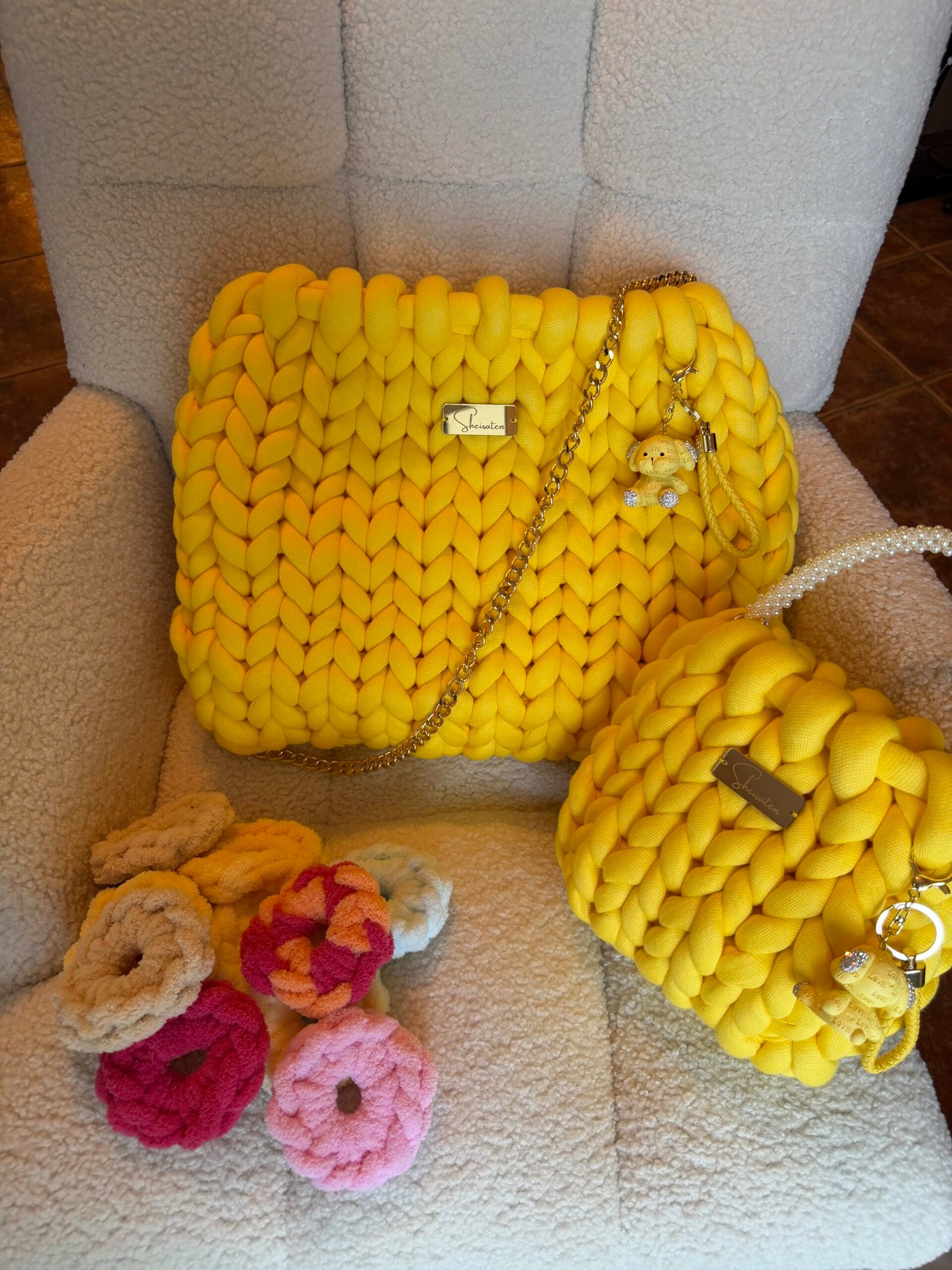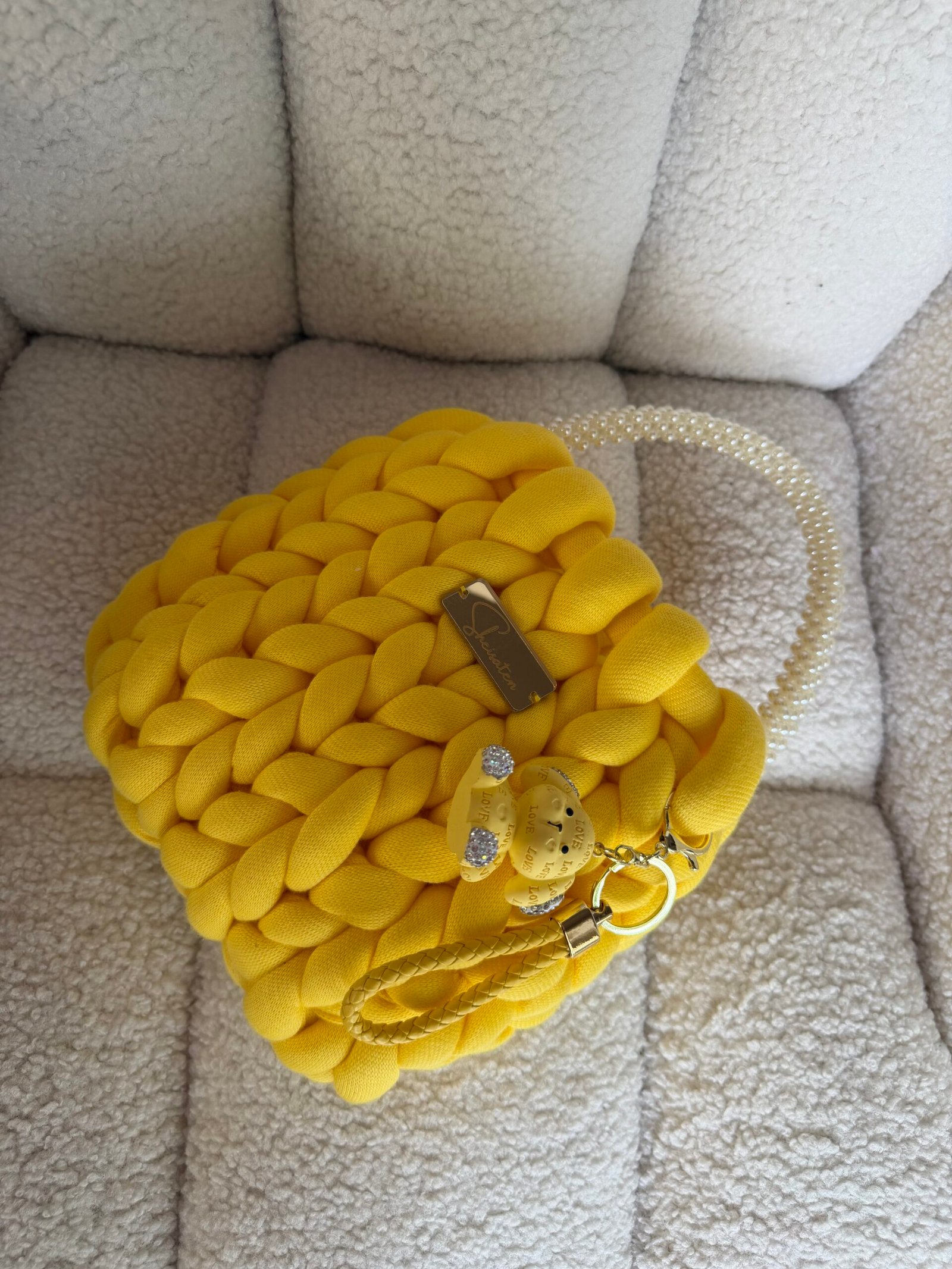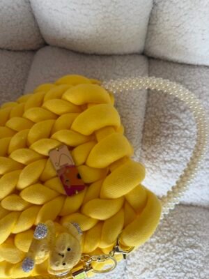 Χειροποίητη πλεκτή τσάντα σε κίτρινη απόχρωση, σχεδιασμένη για να ξεχωρίζει σε κάθε εμφάνιση. Το ιδιαίτερο chunky πλέξιμο δημιουργεί ένα εντυπωσιακό, μοντέρνο αποτέλεσμα, ενώ η απαλή υφή της προσφέρει μοναδική αίσθηση πολυτέλειας.