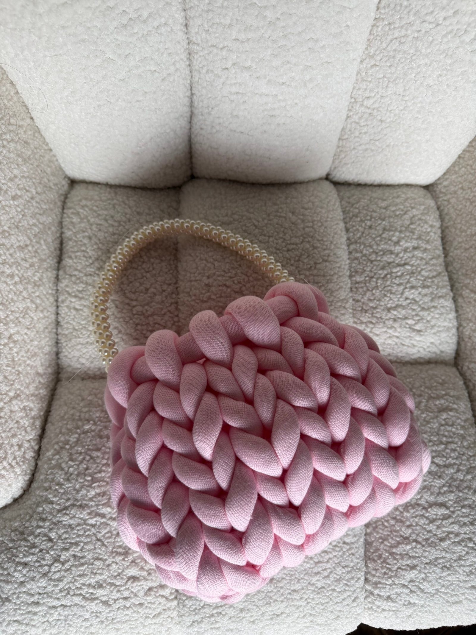 Μοναδική χειροποίητη πλεκτή τσάντα σε ροζ χρώμα που τραβάει την προσοχή. Κατασκευασμένη από μαλακό, chunky ύφασμα, προσφέρει cozy αλλά και μοντέρνο στυλ. Το  χερούλι είναι χειροποίητο με πέρλες και ξεχωριστή αισθητική.