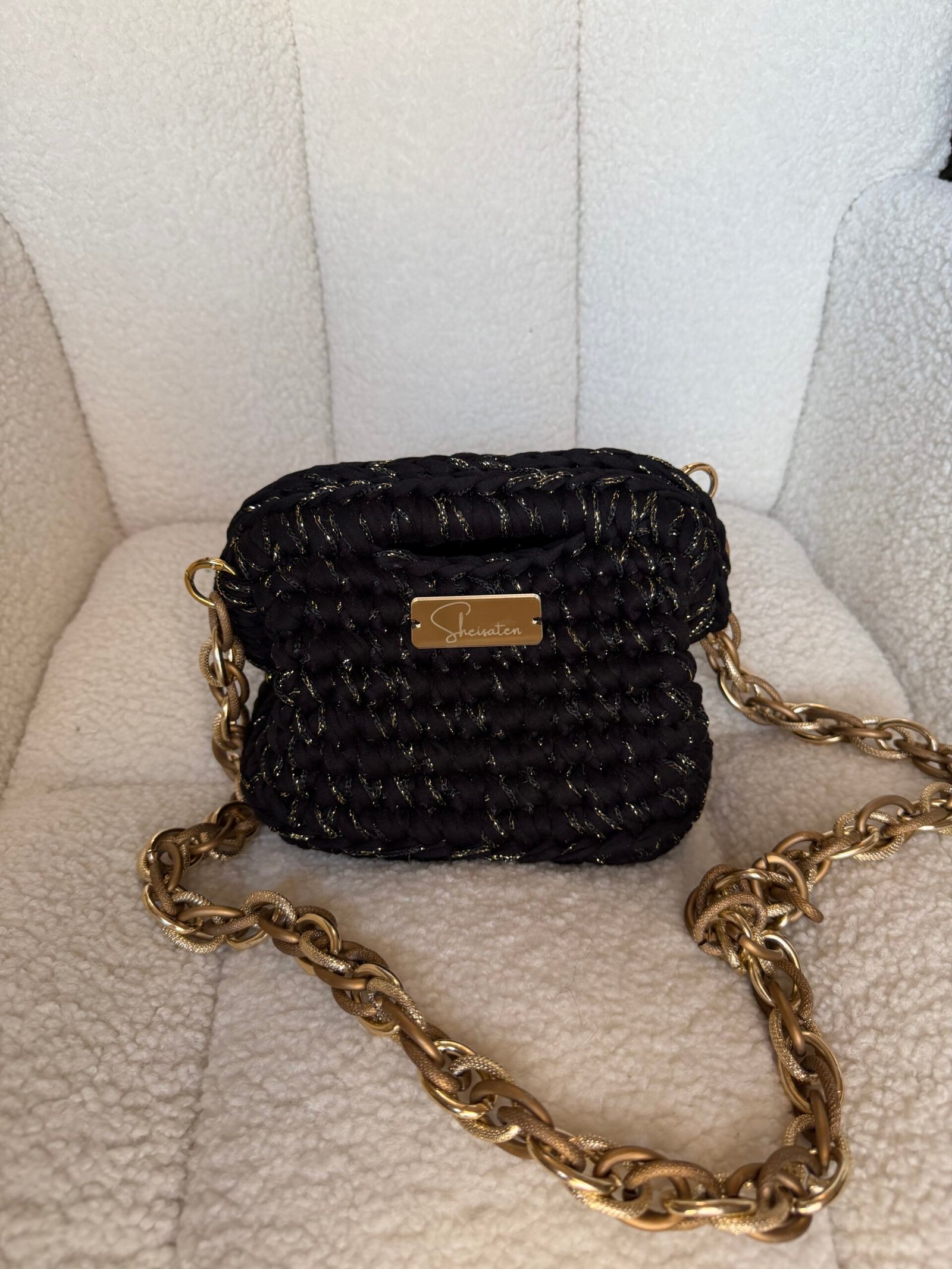 Μίνι χειροποίητη τσάντα, ιδανική για βραδινές εξόδους και elegant εμφανίσεις. Διαθέτει ελασμά 20 εκ. και πυκνή χρυσή αλυσίδα, που λειτουργεί τόσο ως λουρi όσο και ως statement διακοσμητικό στοιχείο. Η πλέξη είναι σφιχτή και προσεγμένη, δίνοντας αίσθηση πολυτέλειας.