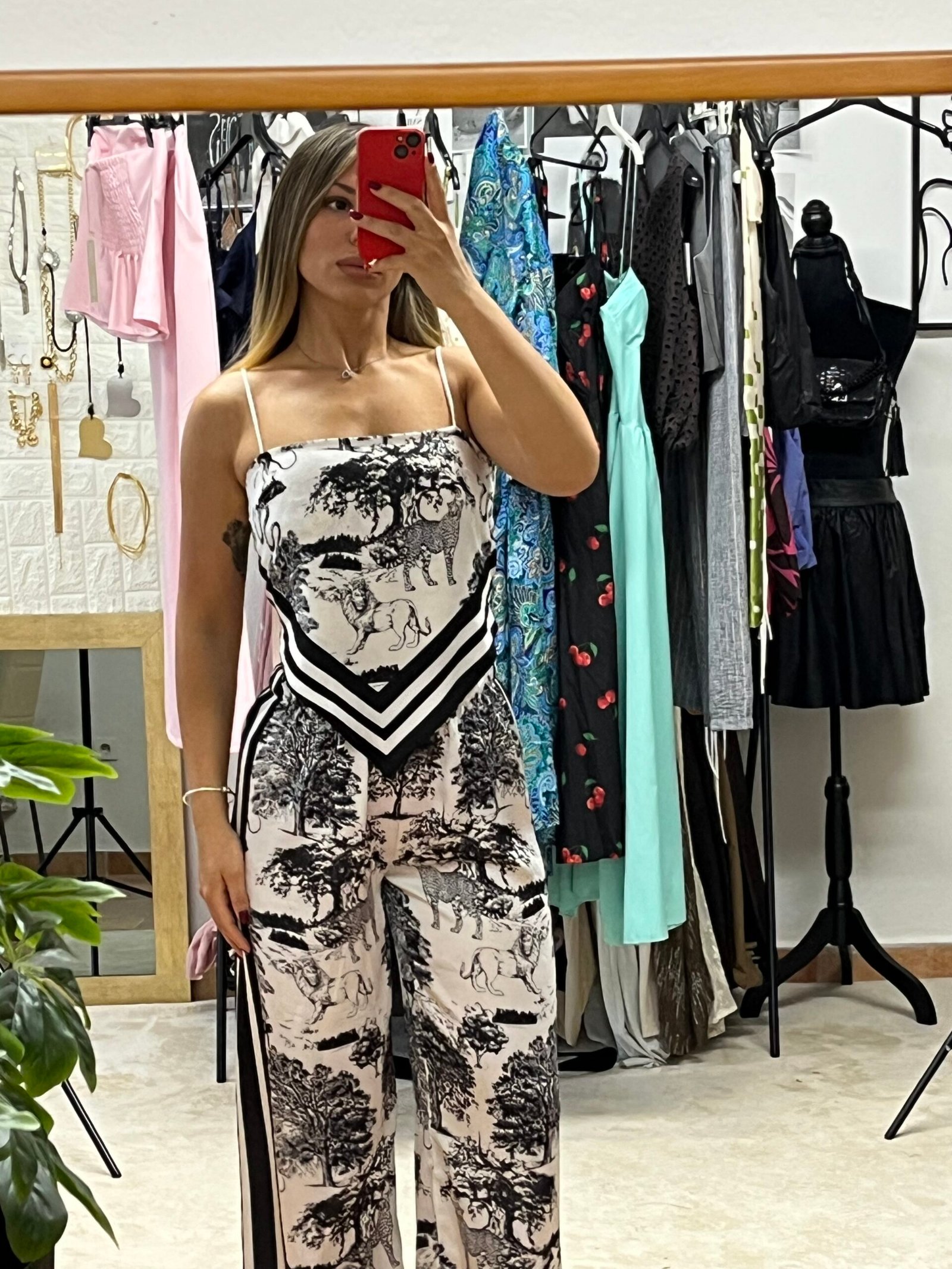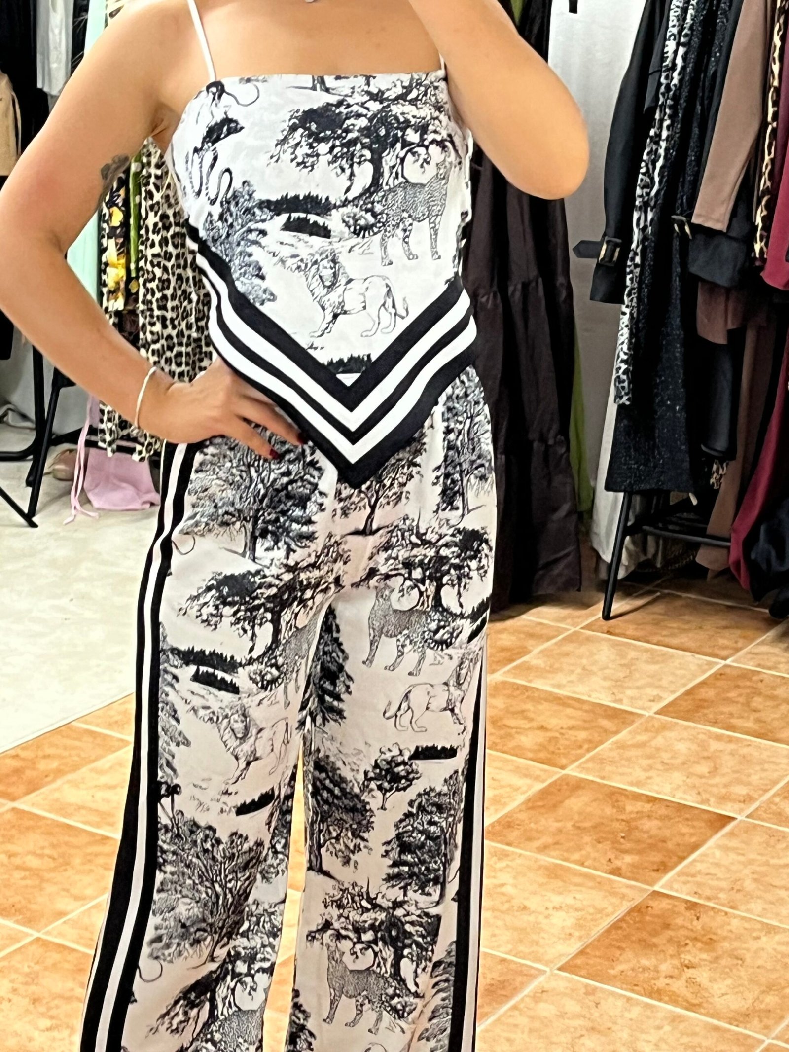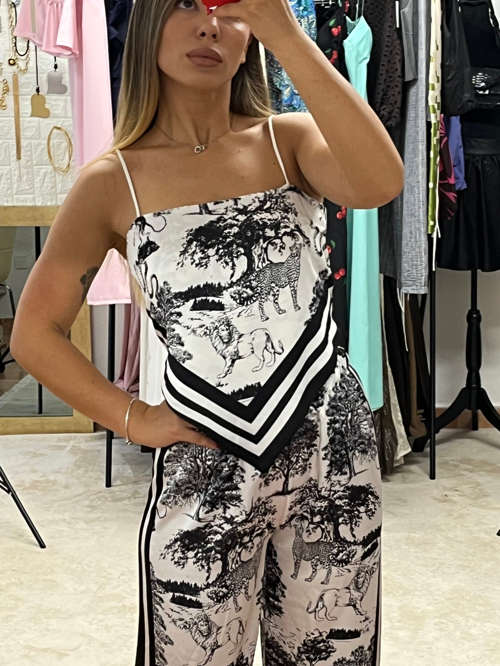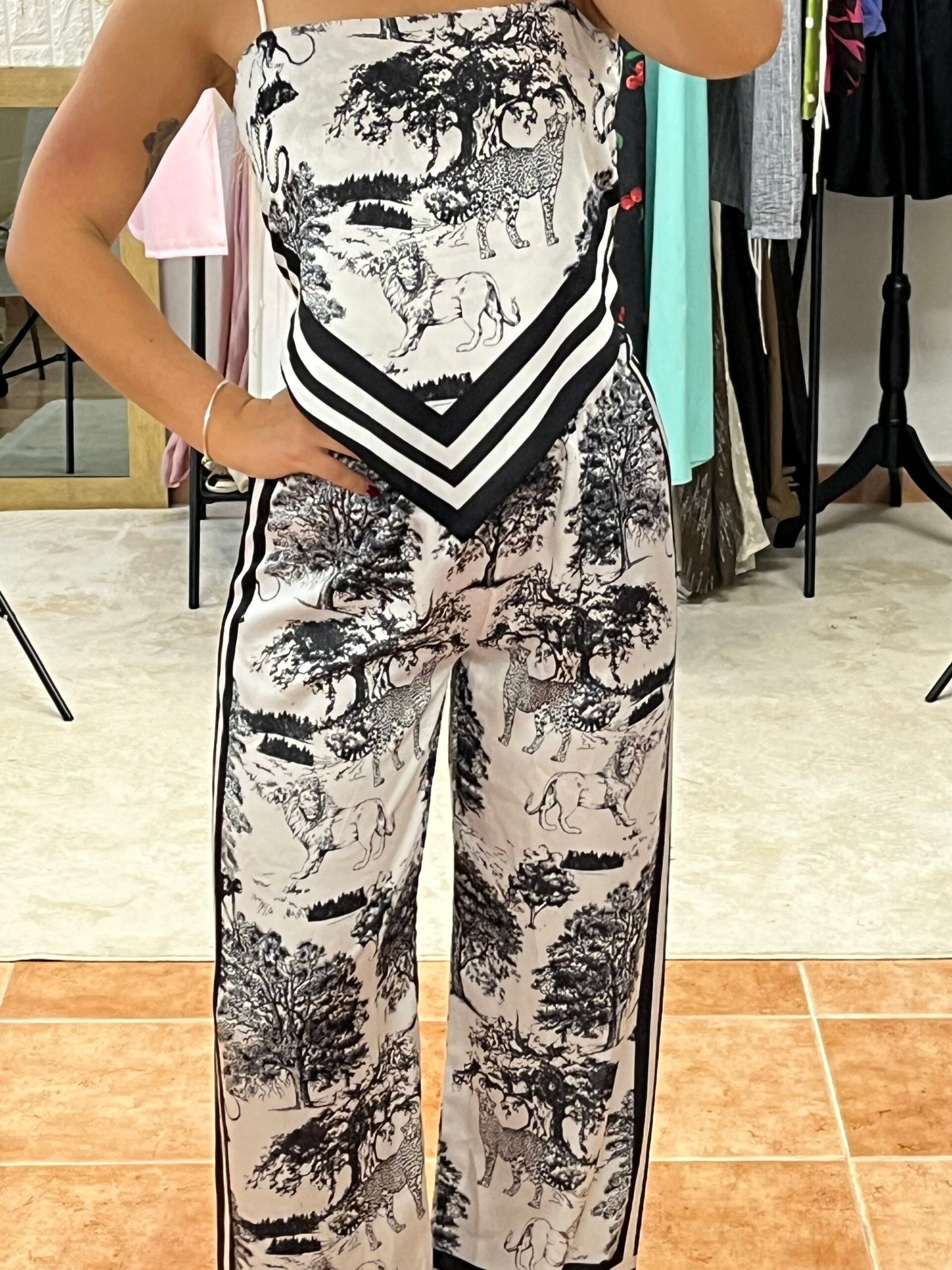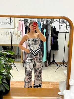 Ένα statement σετ που συνδυάζει άνεση και στιλ! Το Safari Chic Set αποτελείται από top και παντελόνι με εντυπωσιακό animal-print μοτίβο σε αποχρώσεις του λευκού και του μαυρου. Το μπλουζάκι διαθέτει λεπτές τιράντες και δένει στην πλάτη με κόμπο, προσφέροντας ρυθμιζόμενη εφαρμογή που θυμίζει κορδόνια. Παράλληλα, έχει ενσωματωμένες τιράντες για στήριξη και καλύτερη εφαρμογή.