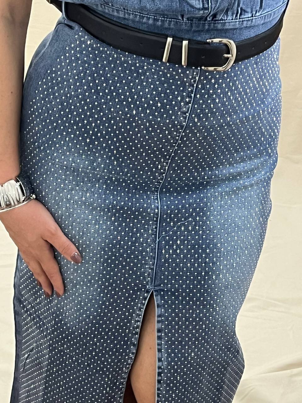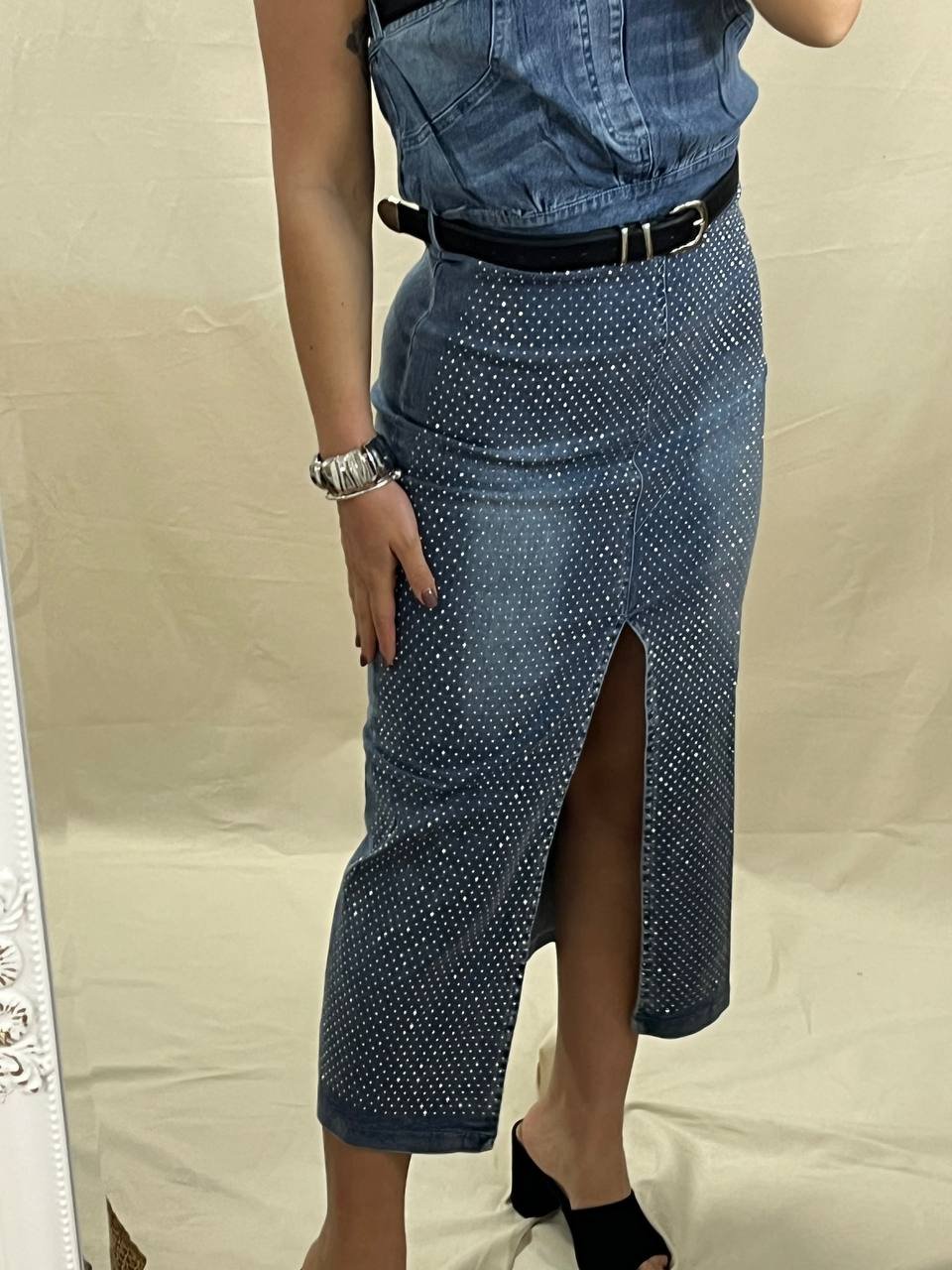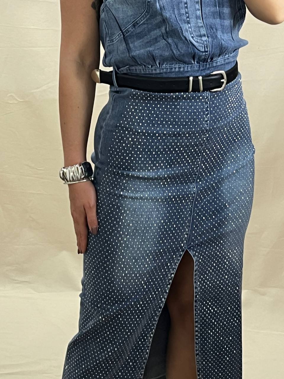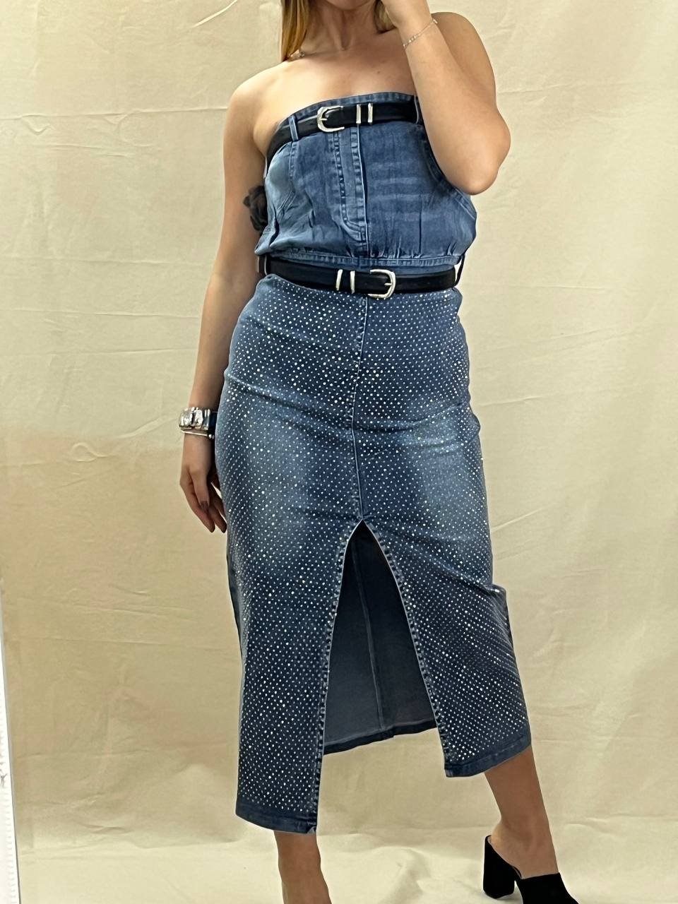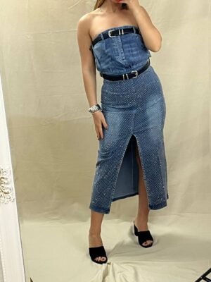 Στυλάτο strapless φόρεμα από ελαστικό τζιν με στρασ, μεταλλικές λεπτομέρειες και διπλές ζώνες. Διαθέτει άνετη γραμμή, μπροστινό άνοιγμα και διατίθεται σε μεγέθη S/M/L. Οι ζώνες περιλαμβάνονται.