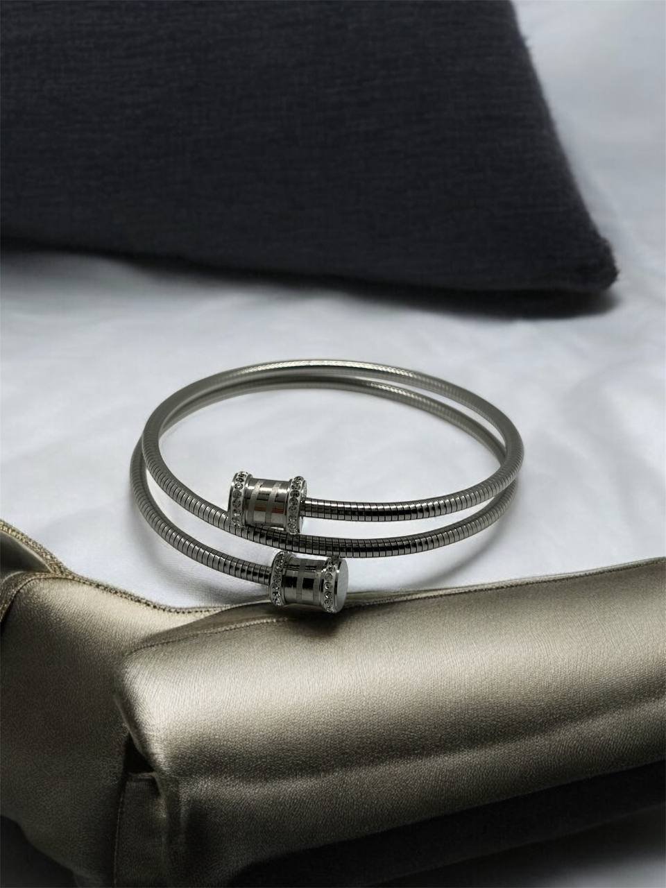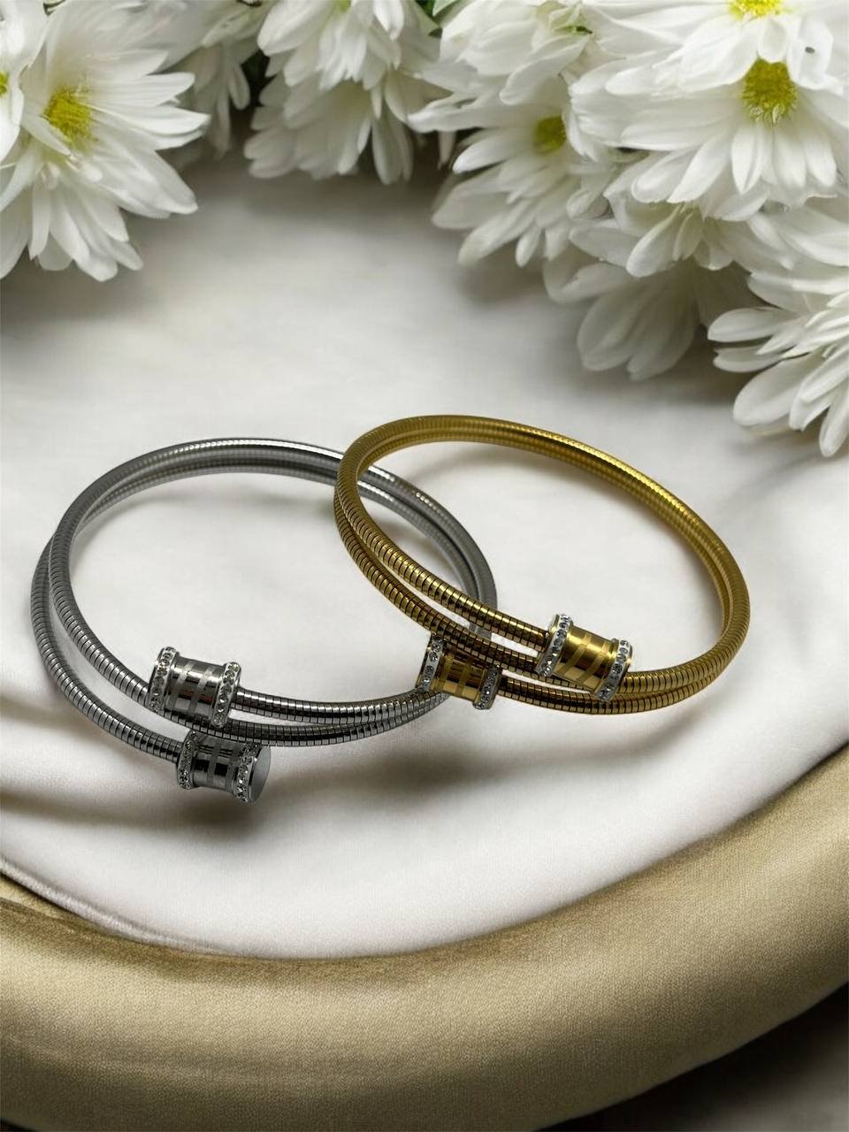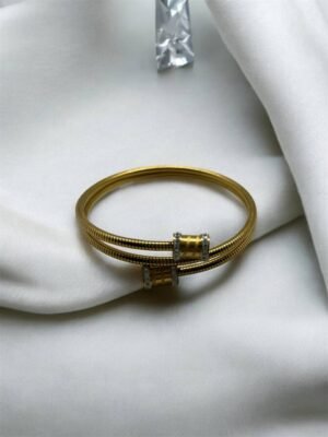 Εντυπωσιακό γυριστό χρυσό βραχιόλι με κυλίνδρους διακοσμημένους με διαμαντάκια στις άκρες. Κομψό και πολυτελές, ιδανικό για μοναδικές εμφανίσεις και elegant δώρα
