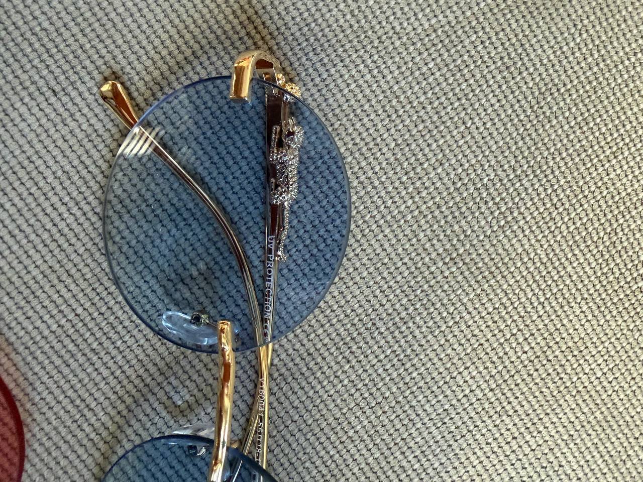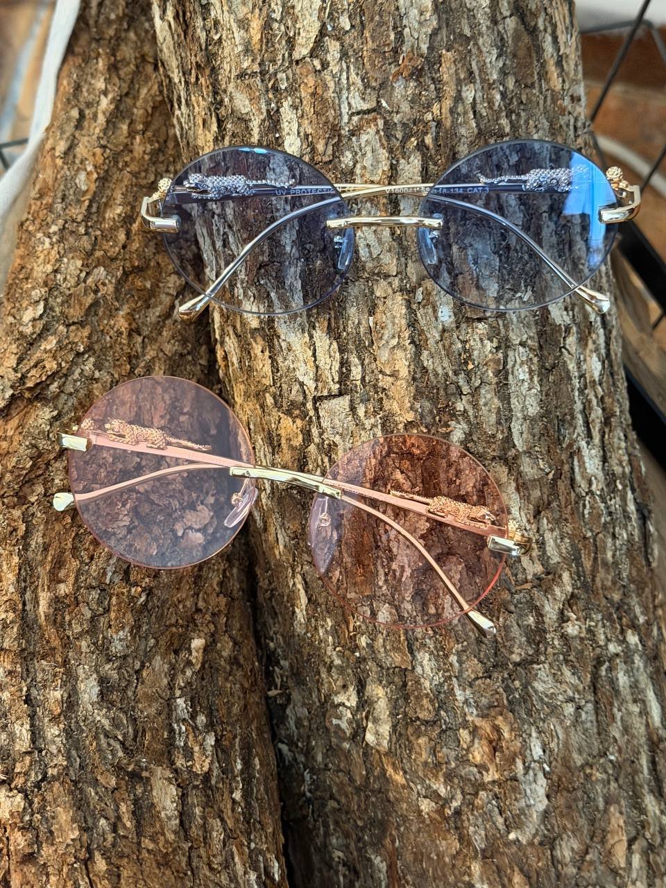 Γυαλιά ηλίου υψηλής αισθητικής με διακοσμητικό πάνθηρα στους βραχίονες – ένα statement κομμάτι που συνδυάζει πολυτέλεια και δυναμισμό. Η rimless στρογγυλή σχεδίαση και ο λεπτός χρυσός μεταλλικός σκελετός προσφέρουν διαχρονική κομψότητα, ενώ οι φακοί σε μπλε και ροζ-χρυσαφί αποχρώσεις χαρίζουν ξεχωριστό στυλ.